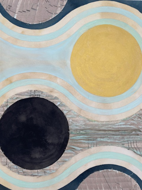 Watercolor and acrylic on paper, string, sewing pattern, cradled wooden panel