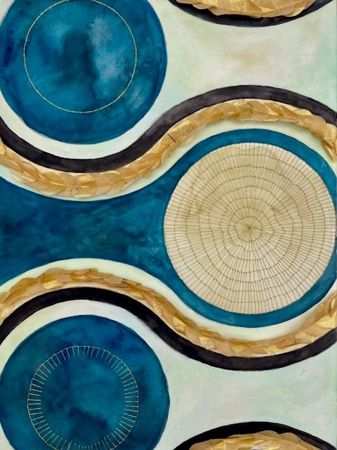 Watercolor and acrylic on paper, string, sewing pattern, cradled wooden panel