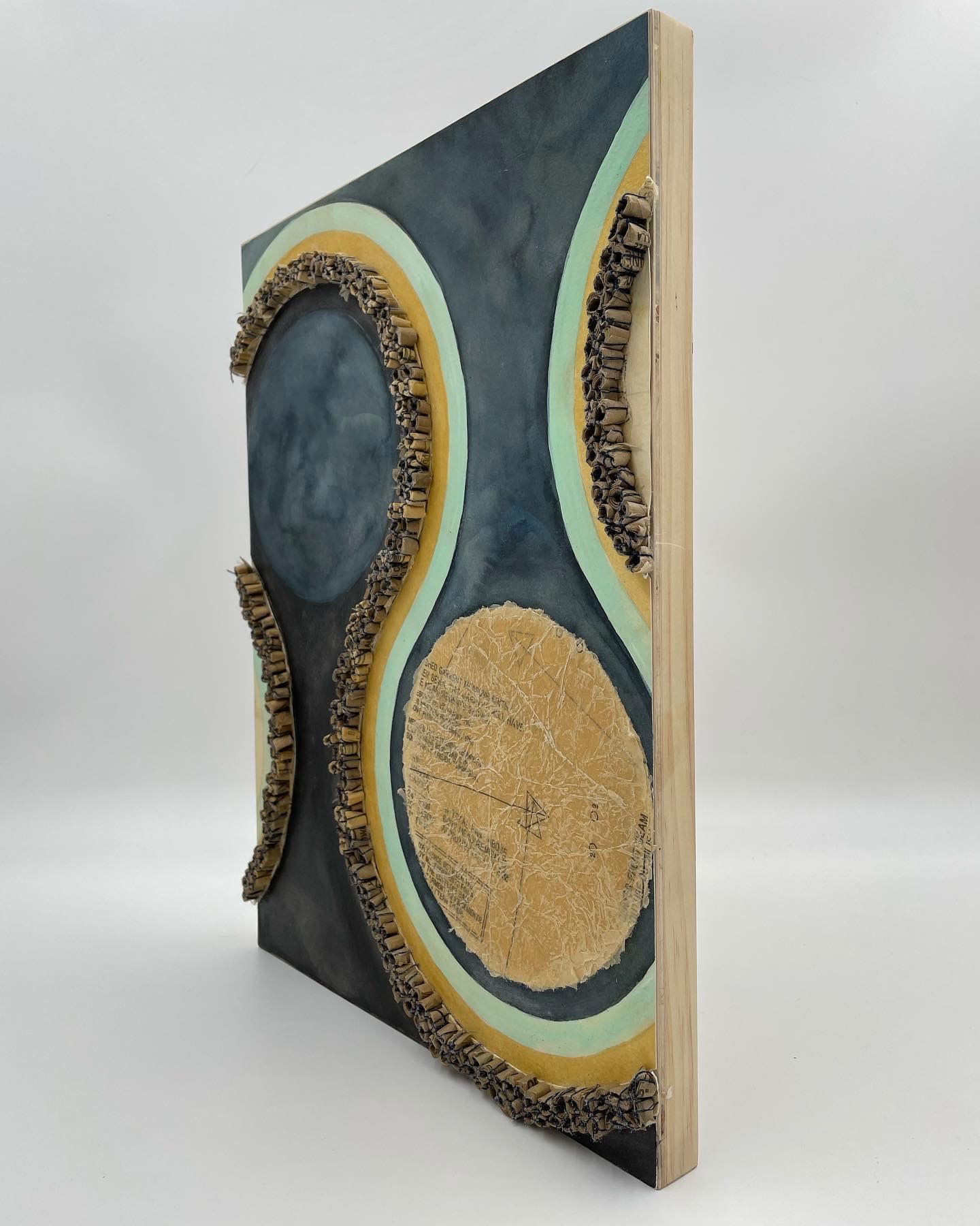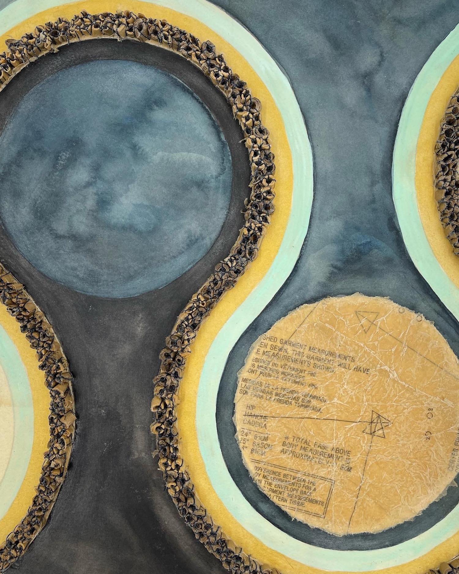 Watercolor and acrylic on paper, string, sewing pattern, cradled wooden panel