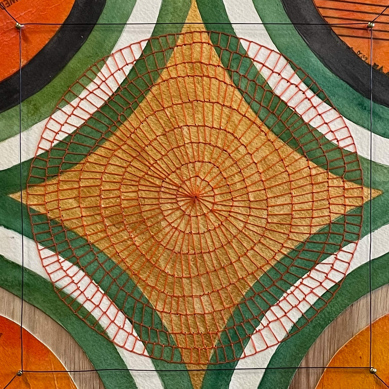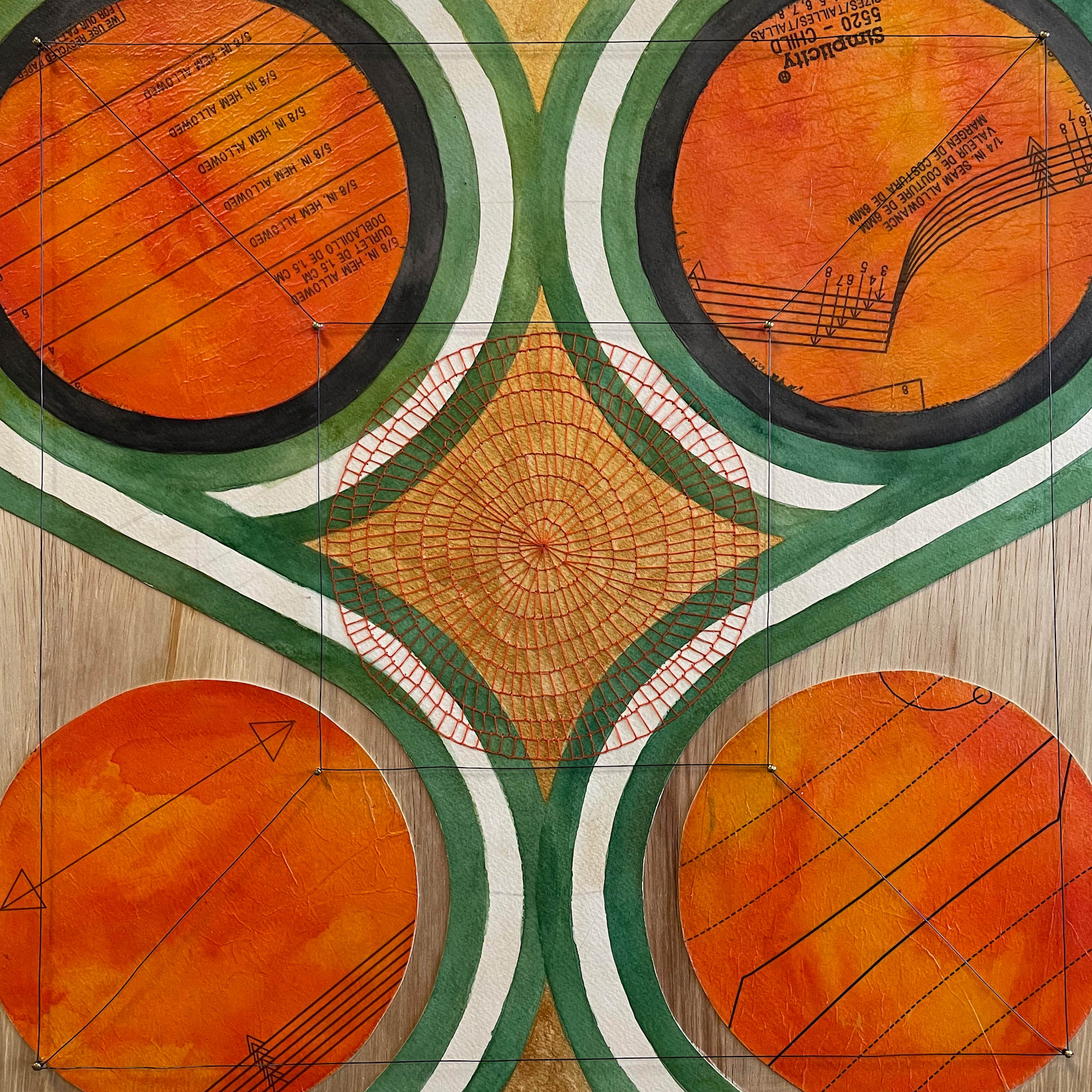 Watercolor on paper, string, sewing pattern, brass tacks, wire, wood
