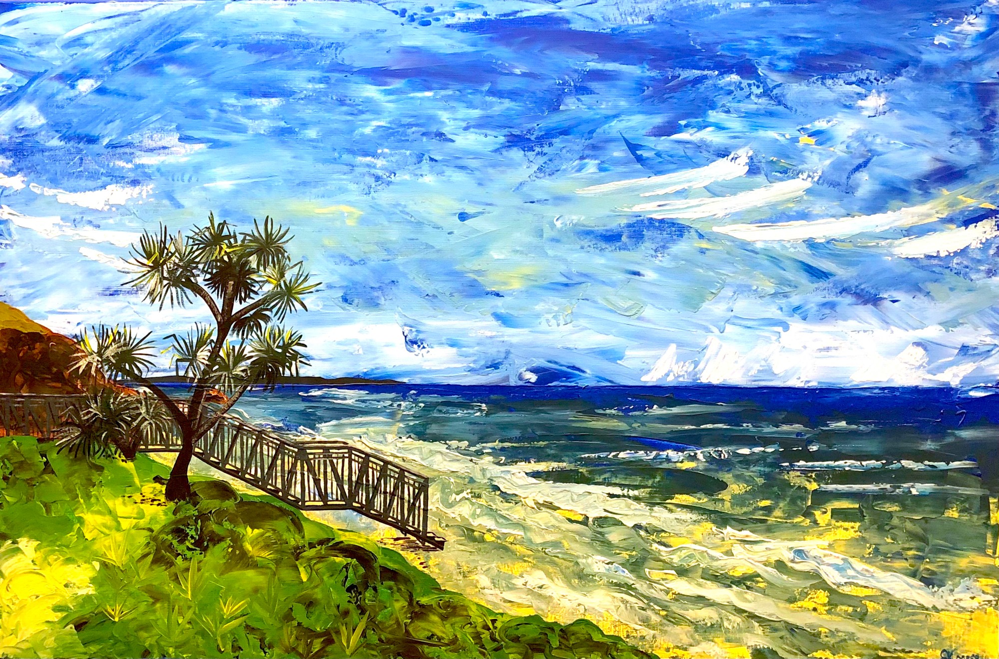 When I graduated from the Queensland University of Technology at the end of 2015 and left everything and everyone I knew to move to ‘a little town up north’, there were many moments of loneliness as I established my new life and community away from my family and oldest friends. Yeppoon Main Beach was the place to which I would retreat when I needed a place to just be still and spend time with my God - the one thing in my life that would always be constant. There’s something about the beach that calms the soul, where I feel closest to my Creator. The power of the waves crashing against the rocks reminding me that my God is in control. The rhythmic back and forth of the tide soothing the chattering in my mind. The warmth of the sun on my skin reminding me of the warmth of God’s love. The cool, salty sea breeze cleansing and refreshing my lungs. And the deep blue of the sea contrasting with the golden sand, on the background of a crystal clear Queensland sky, with only a few whisks of clouds, delighting my eyes and bringing such joy that I can’t quite express. The stairs leading from the old Yeppoon Life Savers Club to the beach serve as the entryway to my haven, my happy place, where I can walk the beach for hours and talk with my Creator. The iconic pandanus tree on the bank leans in towards the sunshine, as it’s leaves are ruffled gently by the ocean breeze. The vibrant, joyful colours and sweeping textures have been used in this composition to capture these emotions, feelings, sights and sounds - to capture the beauty and serenity of my happy place, where I feel calm and at peace in the presence of my God.