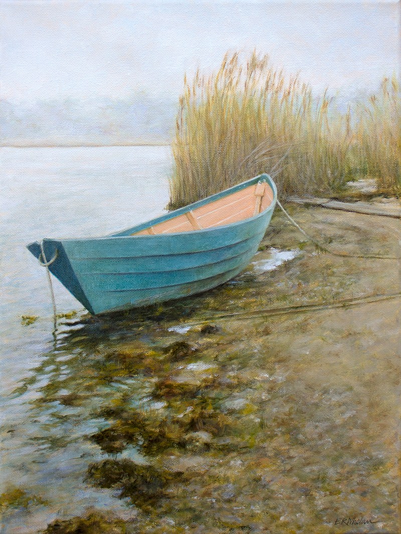 I first saw this boat the very first morning after Bill and I 'washed ashore' on the Island. It was right down on the Lagoon Pond, sitting where the tide left it, and I love the lines of the boat, the paint colors, and the way it glowed in the cool and foggy light. The scene stayed in my mind and I visited the area time and again, eventually rendering the memory in paint.