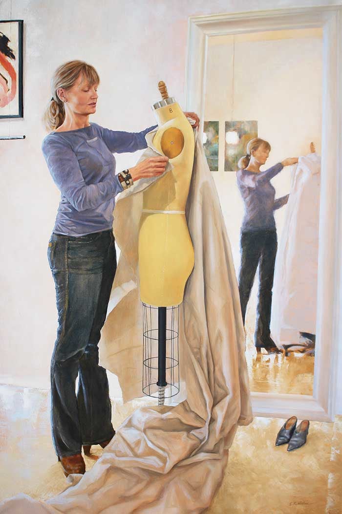 Clothing designer Stina Sayre has always inspired me with her passion and dedication to the creative life. At the time I painted her, Stina was working in her shop on Main Street in Vineyard Haven, with gleaming floors and light streaming in from front windows. As Stina draped the mannequin to create an elegant dress, her reflection in the mirror seemed to take on a life of its own and I was intrigued by the repetition of shapes and color.