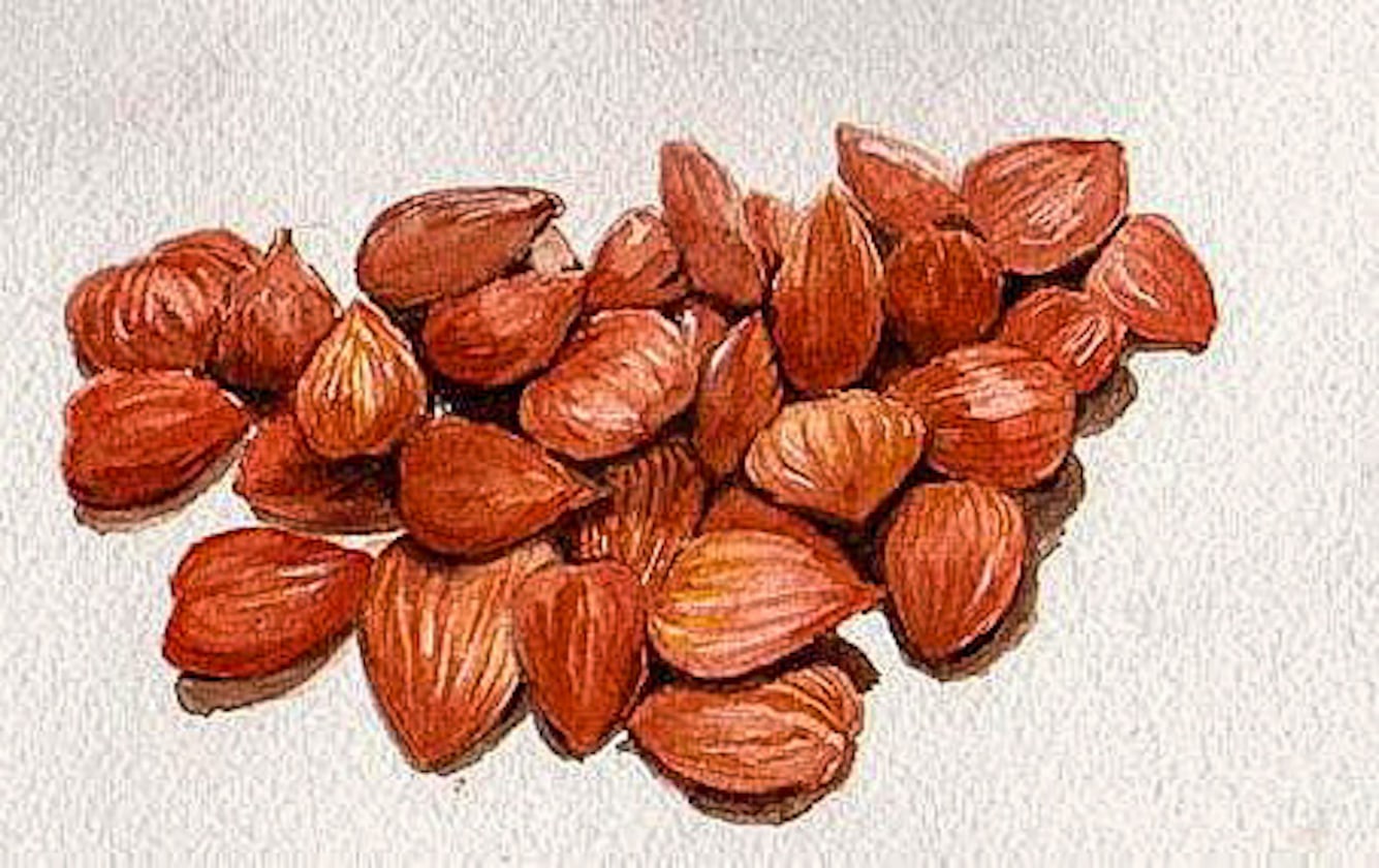 Commercial Art: Watercolor still life of apricot seeds to depict the contents of complimentary Hotel Toiletry items for a company that supplied hotels with these articles.