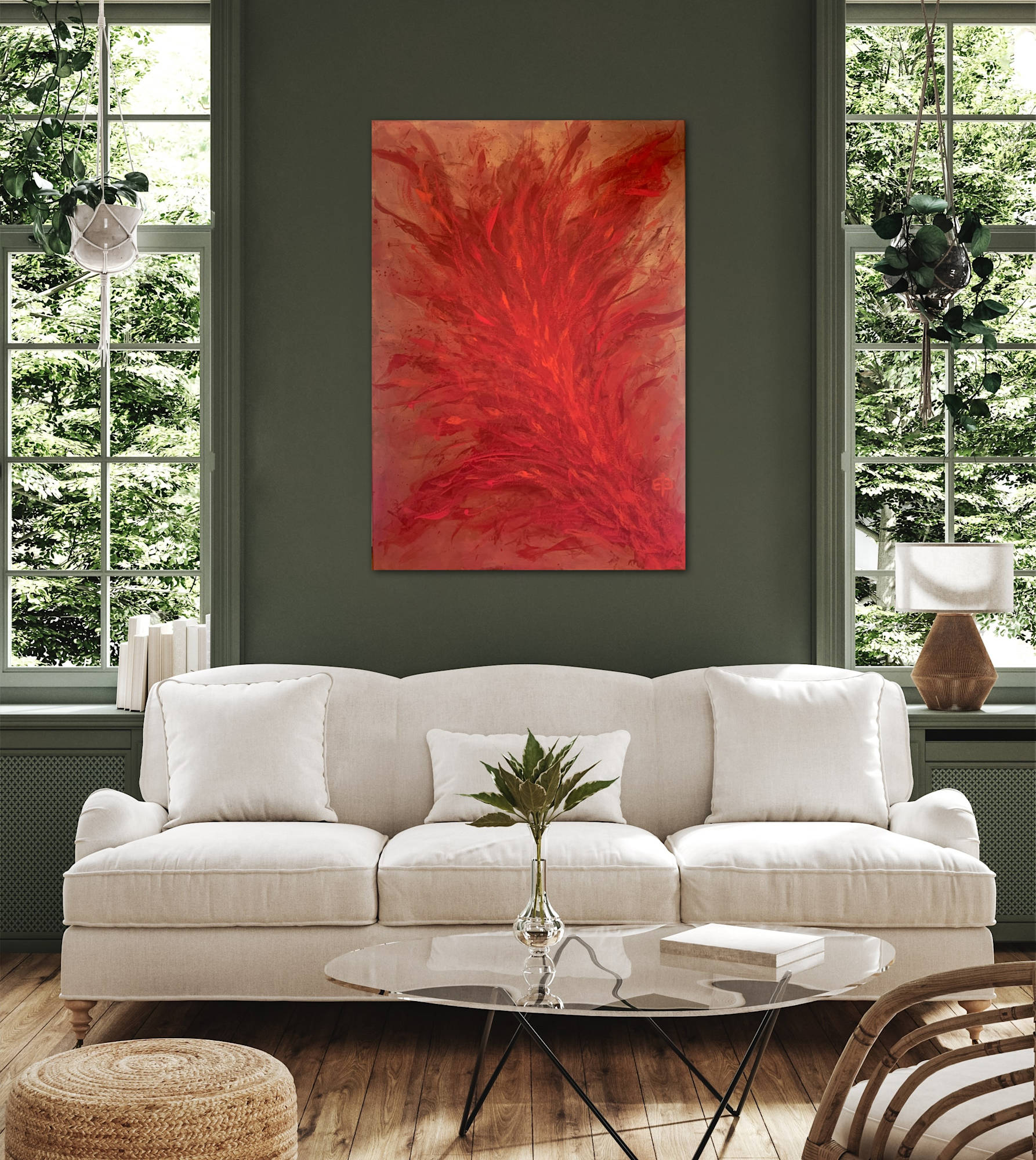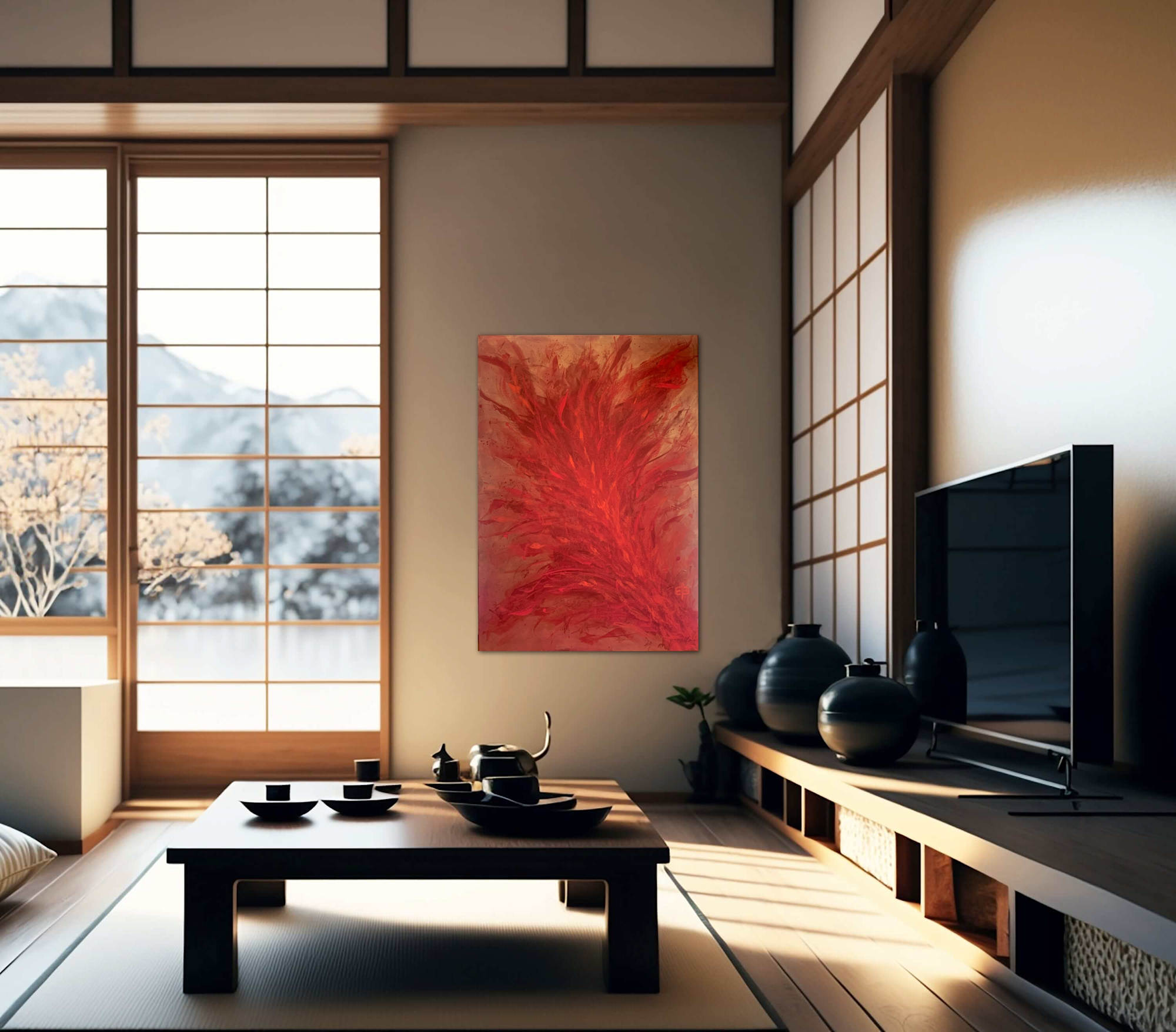 Restrained in red and gold, the painting is an unmissable eye-catcher due to its depth of colour and liveliness. This abstract artwork is especially recommended as a solitaire and eye-catcher and fits any interior style. It fits in a living room, a studio, an office - wherever you want it.