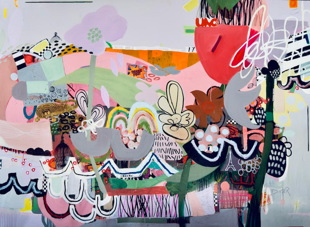 This piece explores the layered conversations between nature and imagination. Shapes of flowers, animals, and abstract forms emerge and dissolve into each other, creating a dreamlike landscape where order and chaos coexist. Bright, playful colors mingle with layered textures, inviting the viewer to find their own stories hidden within the collage-like surface. The work celebrates curiosity, chance encounters, and the beauty of seeing the world through multiple lenses at once.