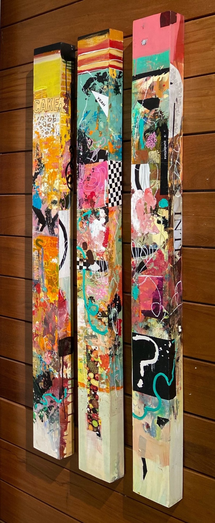 These are wooden box like structures painted on three sides. I used them first as a place to place the excess paint from my brushes as I worked on other paintings. They eventually became the main subject as I went into them adding collage and line work along with some flat spaces of color. They were so so much fun to paint, they sold immediately and I will make more!