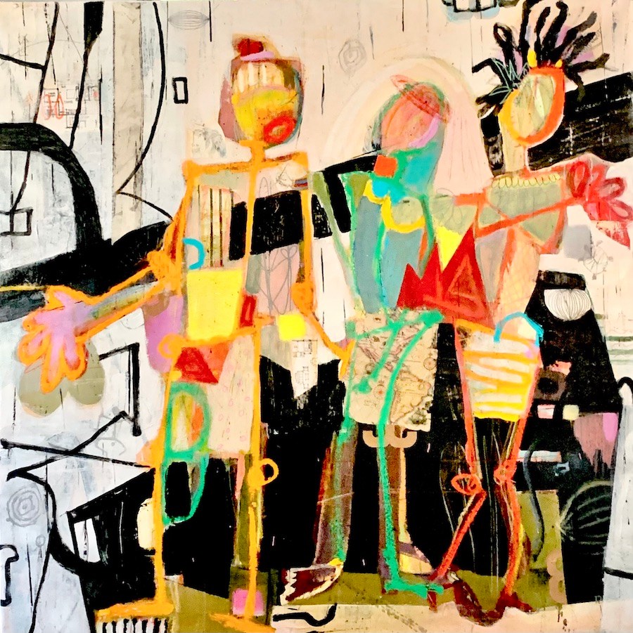 In Fits and Starts...that is how this painting came together! One layer, then another, of color, lines, shapes, where to go? what to paint? and then as always, the images appear magically, the paint directs the shapes create themselves almost by magic. I grab ahold go go forth in this process.