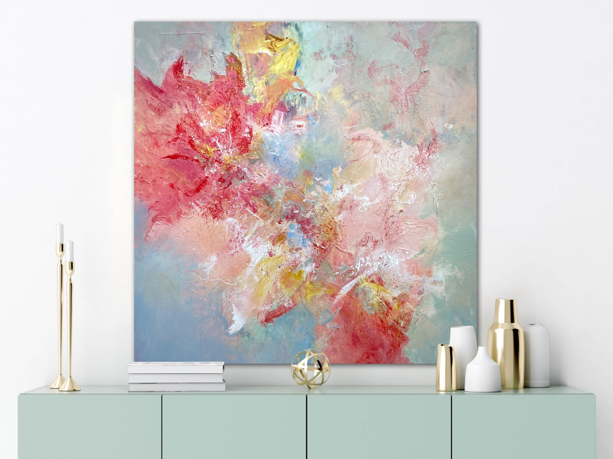 Mixed media on canvas with a warm swath zigzagging through the picture plane.