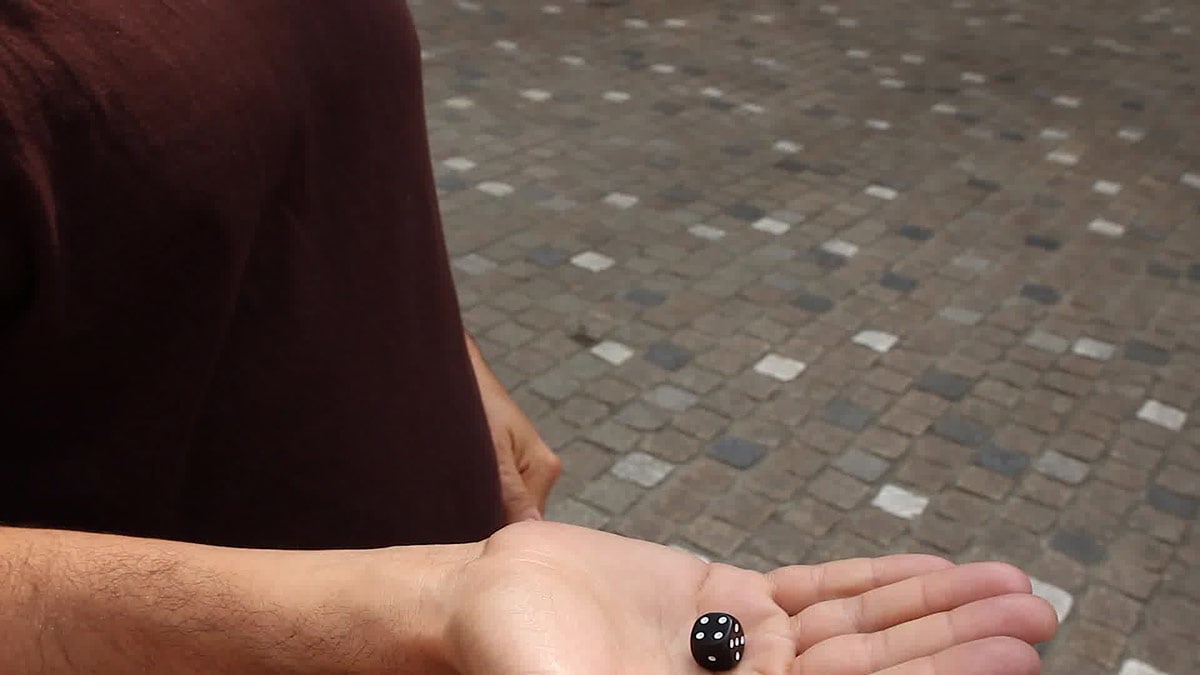 20 minute random itinerary starting from the exhibition space door. At each intersection, a die is used to determine where to go. The result is materialized by a painted wooden sculpture.