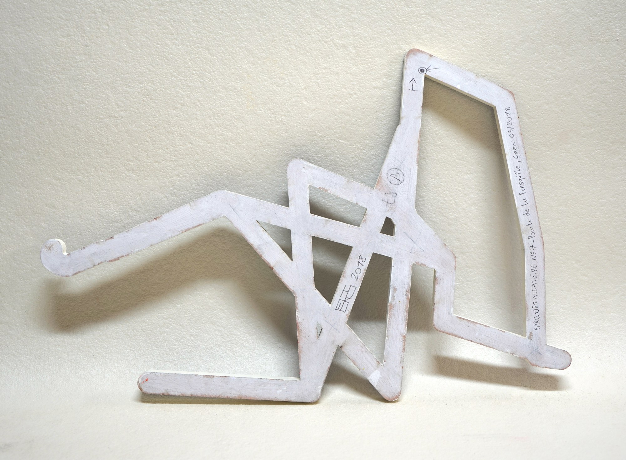 For this random walking exercise, I defined 23 points at key spots around the Pointe de la Presqu'ile area in Caen (building angles, crossroads and corners). The goal was to walk from one point to another choosing at random the next point. The route started at point n.1, had to go through 10 points and finished again at point n.1. The result of each stroll generated a design that was then converted into a wood sculpture. I traced 11 routes. Each sculpture represents a 20 to 40 minutes stroll on a distance from 2 to 3 km.
