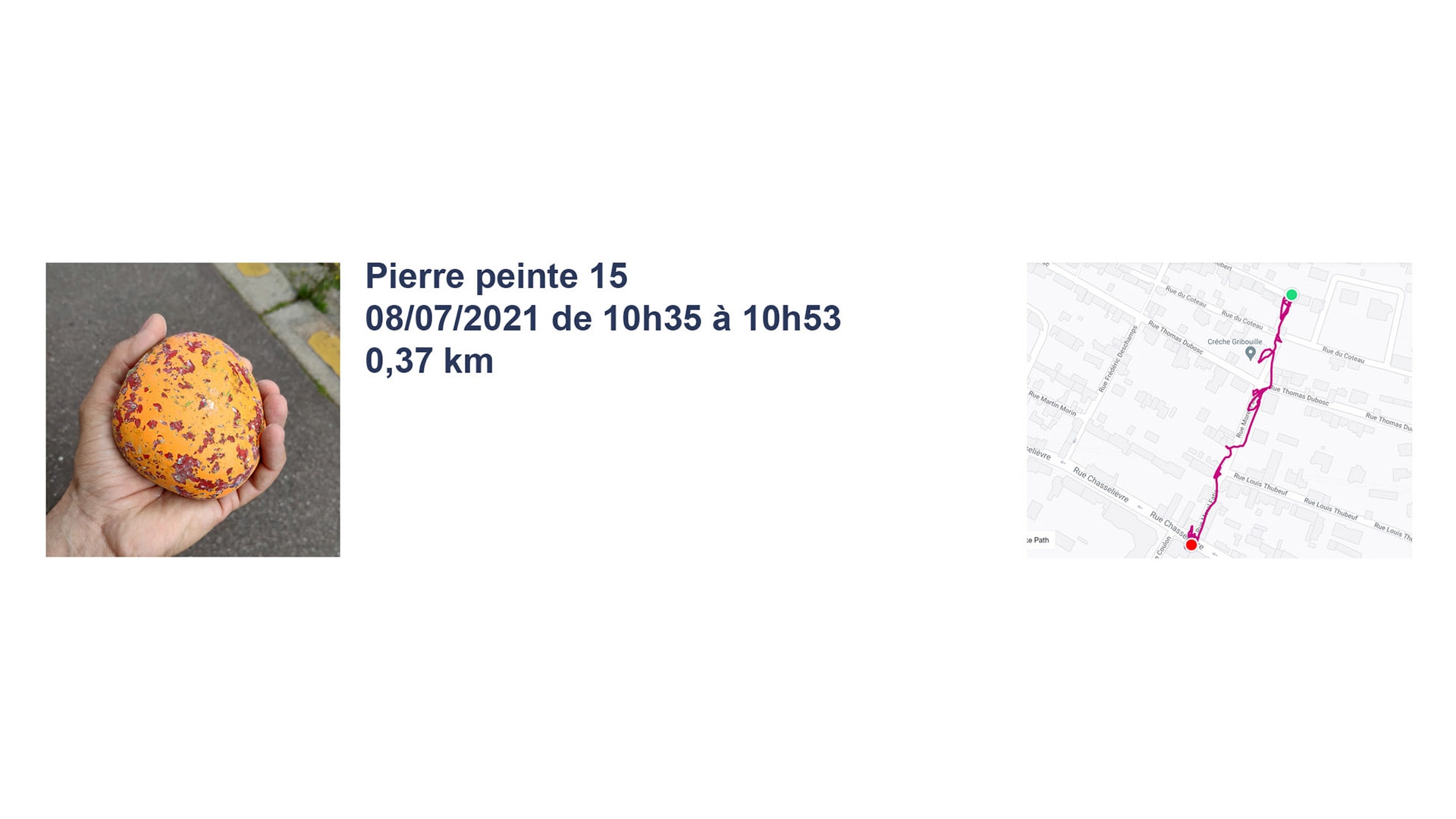 When I arrived at the art center, I went outside to look for rocks. Each rock was painted with three different color coats. The rocks were then brought to the right bank of Rouen and I kicked them to make them roll following predefined paths. Some of them were dropped in the Mont-Saint-Aignan slopes and one, the biggest, rolled on the left bank around the art center.