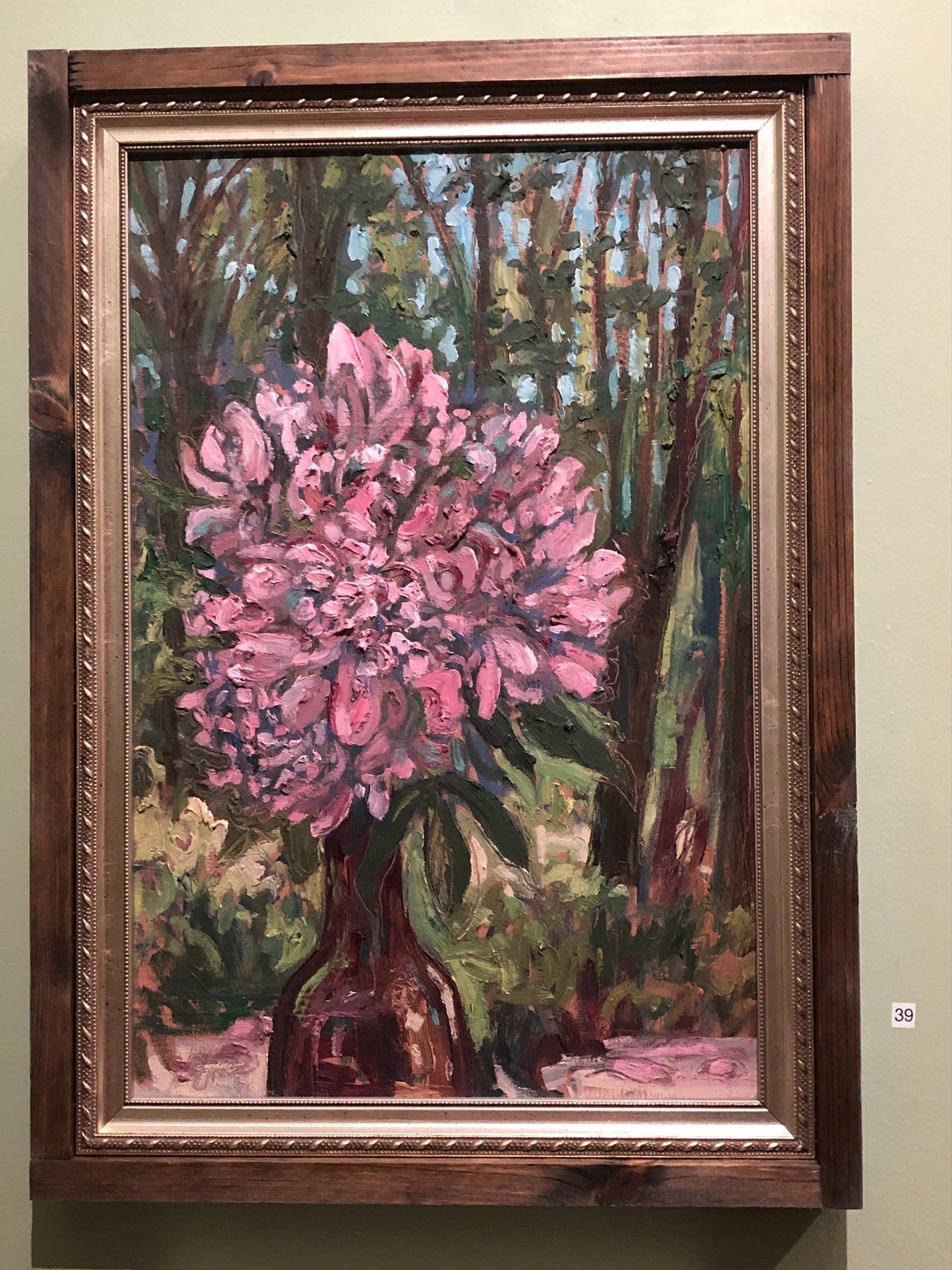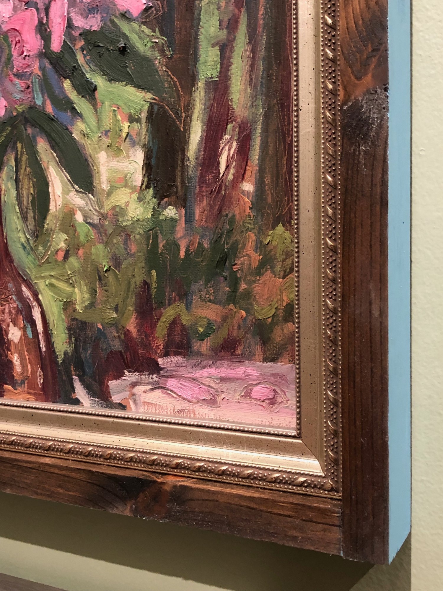 This painting was done right after I discovered mixing cold wax. In person this painting exemplifies the medium. The frame really goes with the piece; knotty pine with deep stain, ornate frame, turqoise sides. Frame and painting together brought me back to a far off memory of a restaurant in Athens, near the Acropolis.