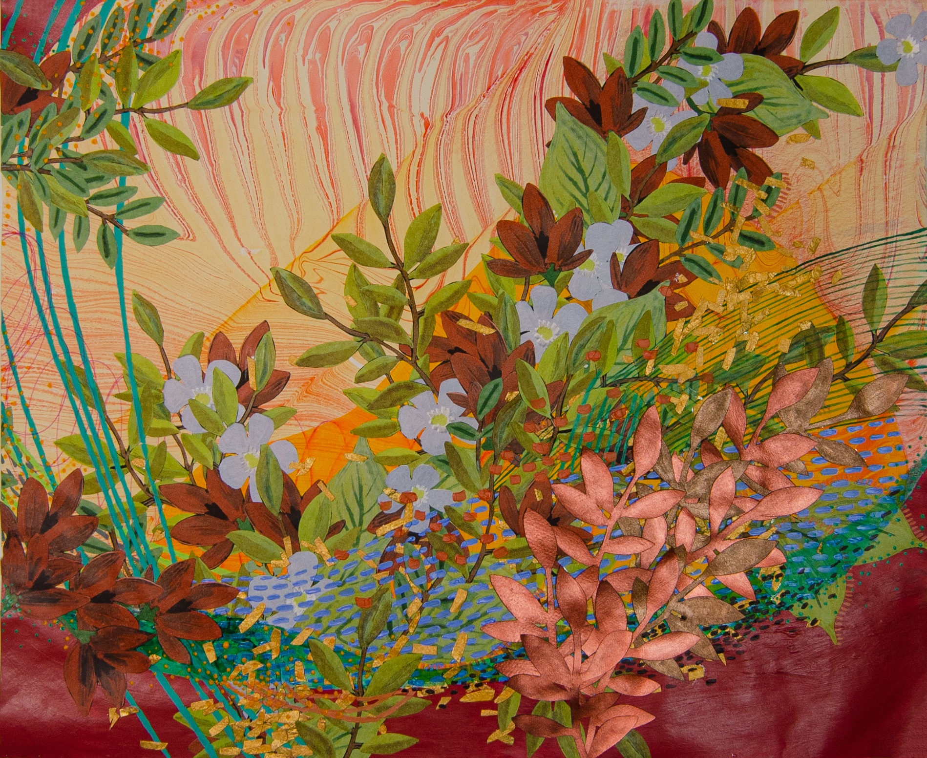 This joyful and dynamic abstract collage is composed of wallpaper, marbled paper, and hand-cut painted paper. The artist meticulously layered and combined these elements, creating a visually engaging composition. The delicate line work of the marbled paper contrasts with the bold patterns of the wallpaper, creating a sense of energy and growth. This artwork invites the viewer to pause and appreciate its intricate details.A Certificate of Authenticity will accompany this piece. This artwork is framed and ready to ship.