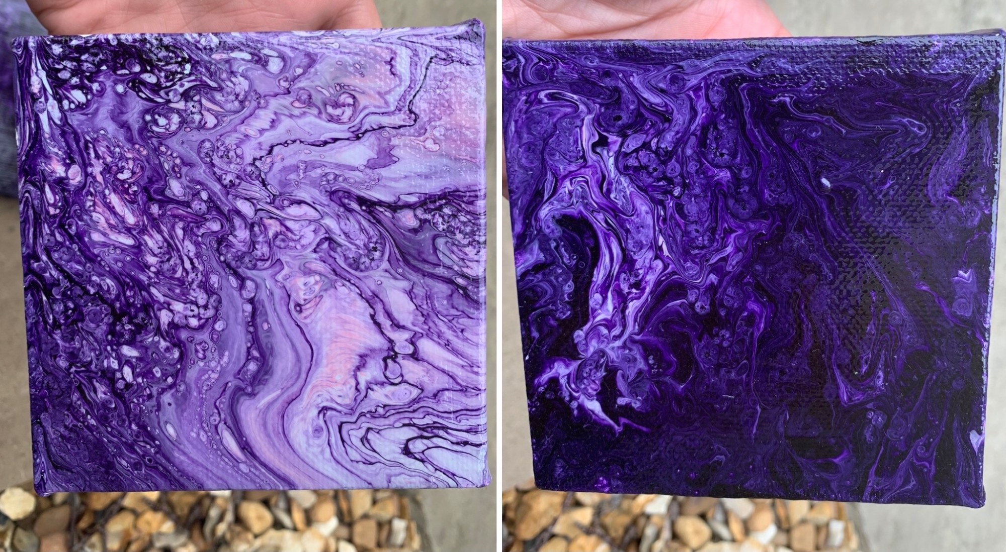 A pair of two mini pours (made at the same time with same colors) on stretched canvas with gloss varnish
