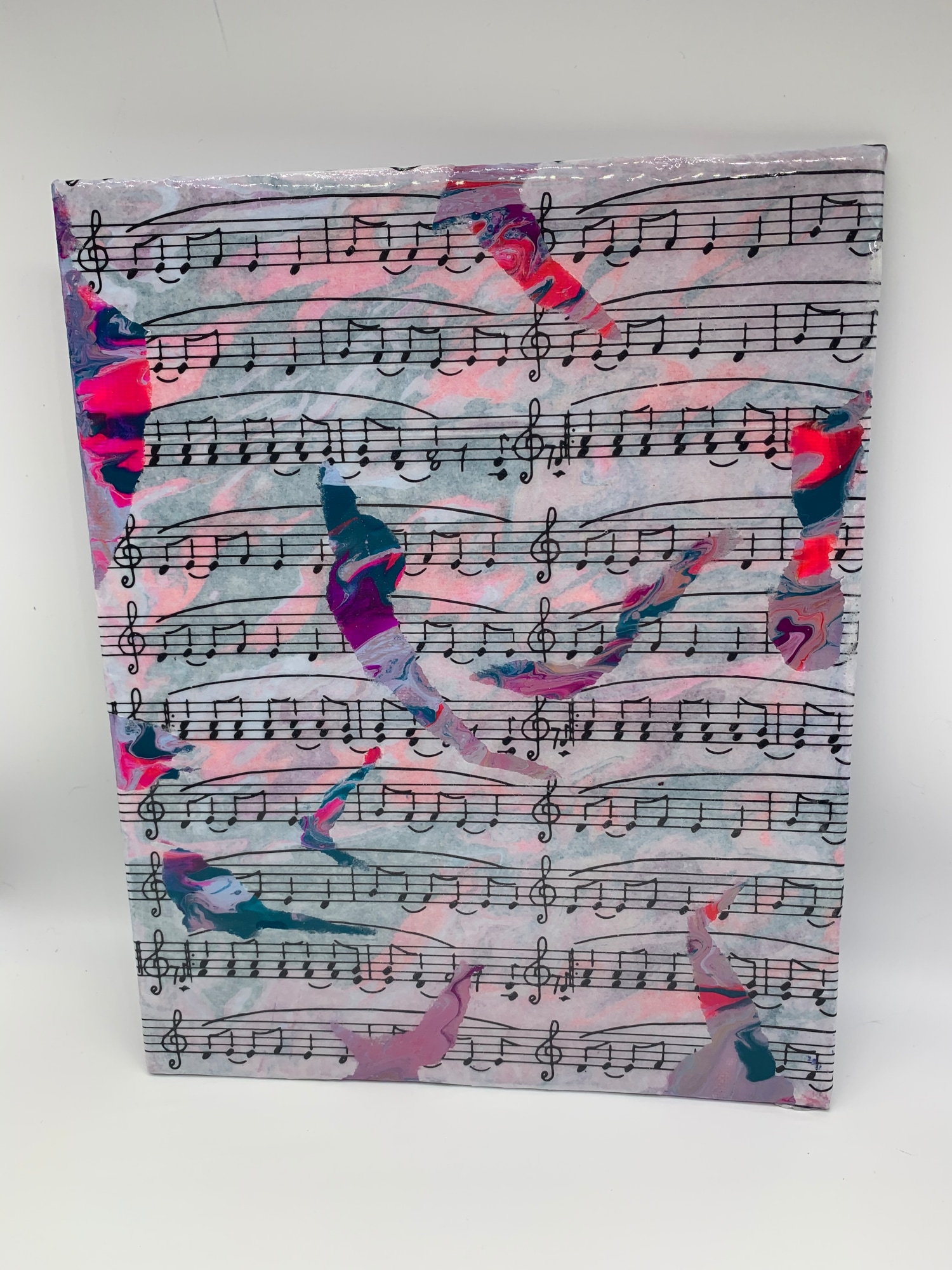 This is an acrylic pour painting on a canvas board with music-themed paper decopauged over and partly peeled away, with a coat of epoxy resin for a smooth finish