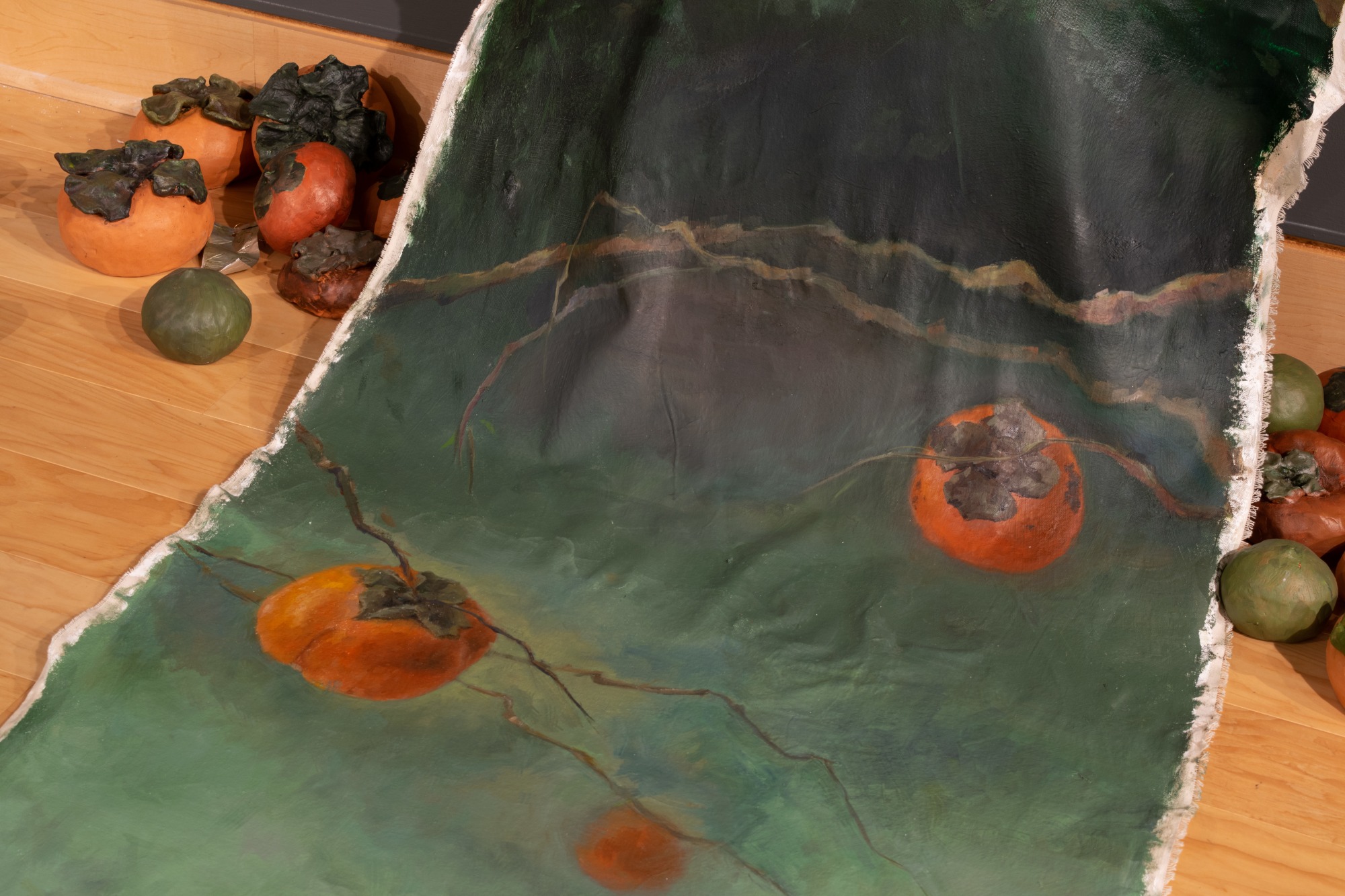 Place is an integral part of my memory of my grandpa. I could never separate him from his farm. In order to celebrate the location, my mom and I harvested dirt from my grandpa’s farm and from the garden outside of his house. Dirt is rarely celebrated, but dirt and soil is what enables plants to grow. It is an essential building block for life. To bring dirt into the context of reverence and celebration, I have removed it from the ground and inlaid it into the two panels of my installation. I have also carefully placed dirt on the floor of the gallery to reference the ground from which the persimmon trees in my memories actually grew.