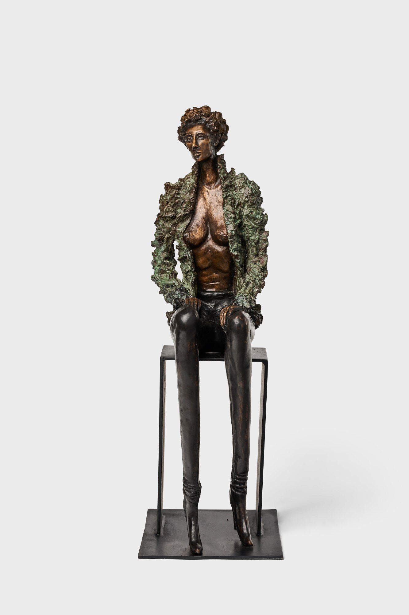 In the “Birds of a Feather” series, Eve is the first female. She exudes an air of striking elegance as she wears a designer faux fur coat, leggings, and ankle boots. The intentionally left-open coat reveals her femininity and vulnerability, adding depth and sensuality to her character. Drawing inspiration from fashion sketches, the elongated limbs exude a quiet elegance, embodying a fusion of fashion, beauty, and softness.