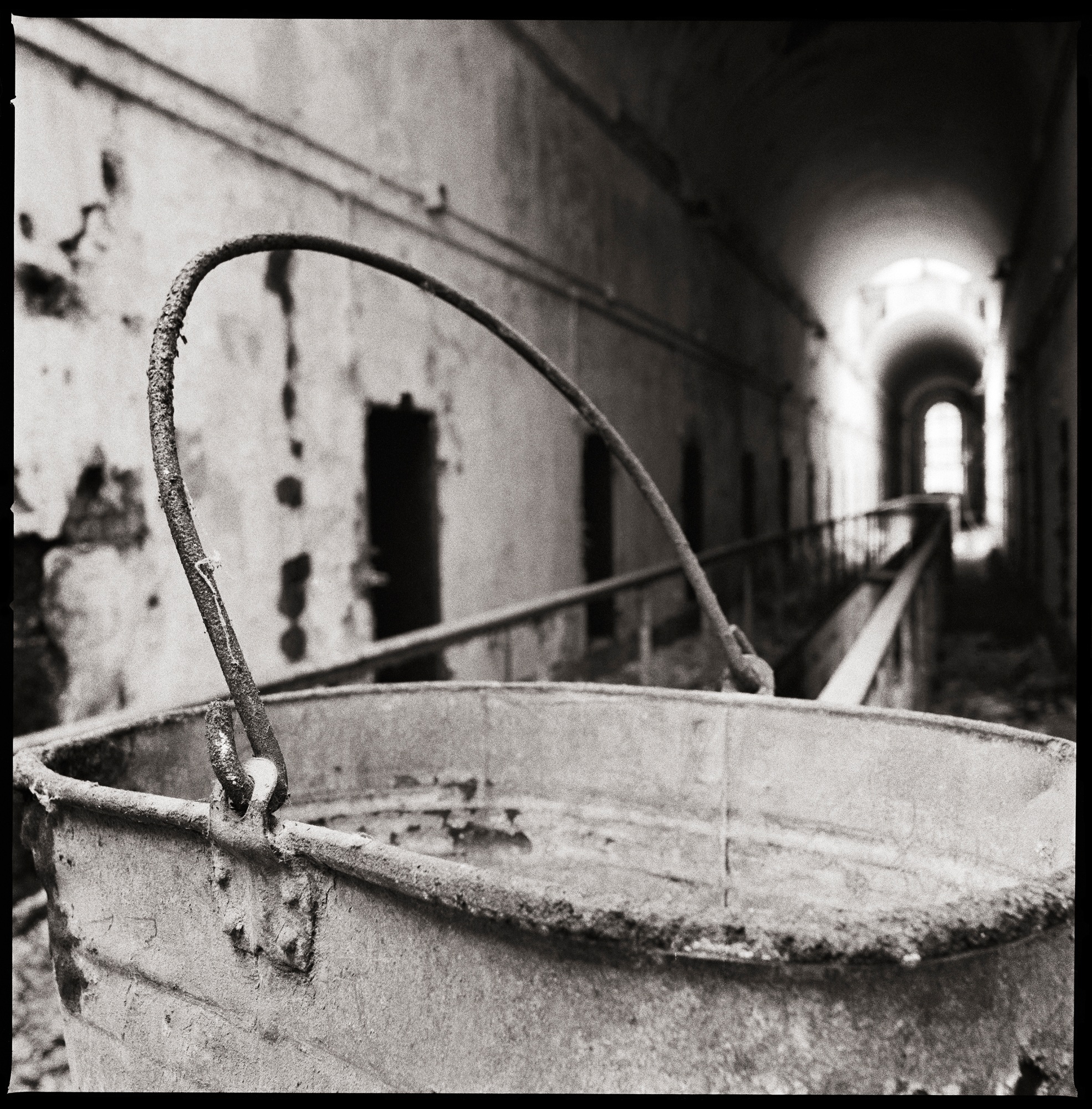 Bucket, Cellblock #6 by Eric T. Kunsman  Image: ID: A black and white image shows a rusted metal bucket in the foreground. In the background, prison cells are visible but not in focus.