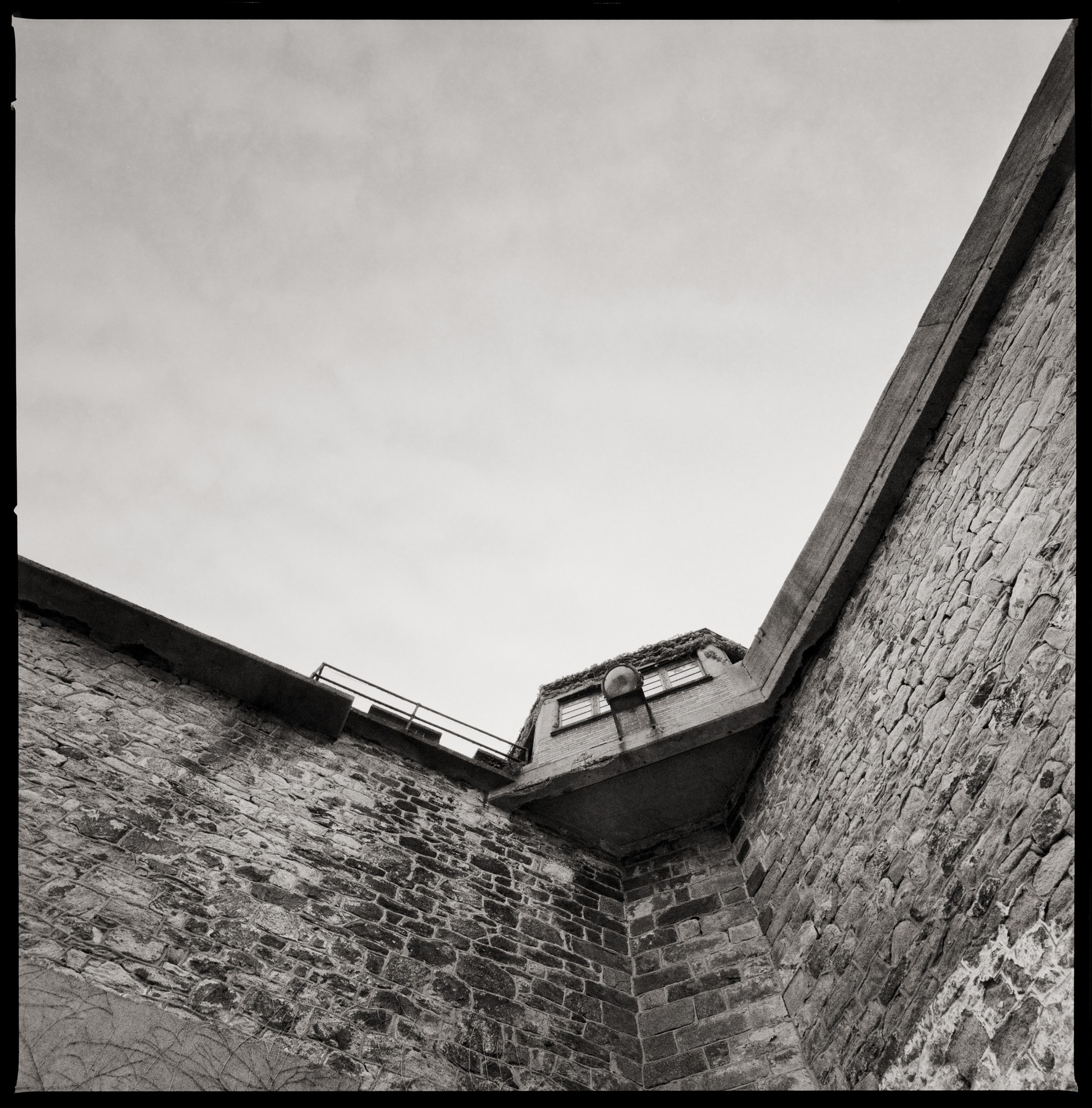 ID: A black and white image shows a upwards view of the corner guard tower. There are not clouds in the sky. The tower has walls that extend from the corner. The building is brick.