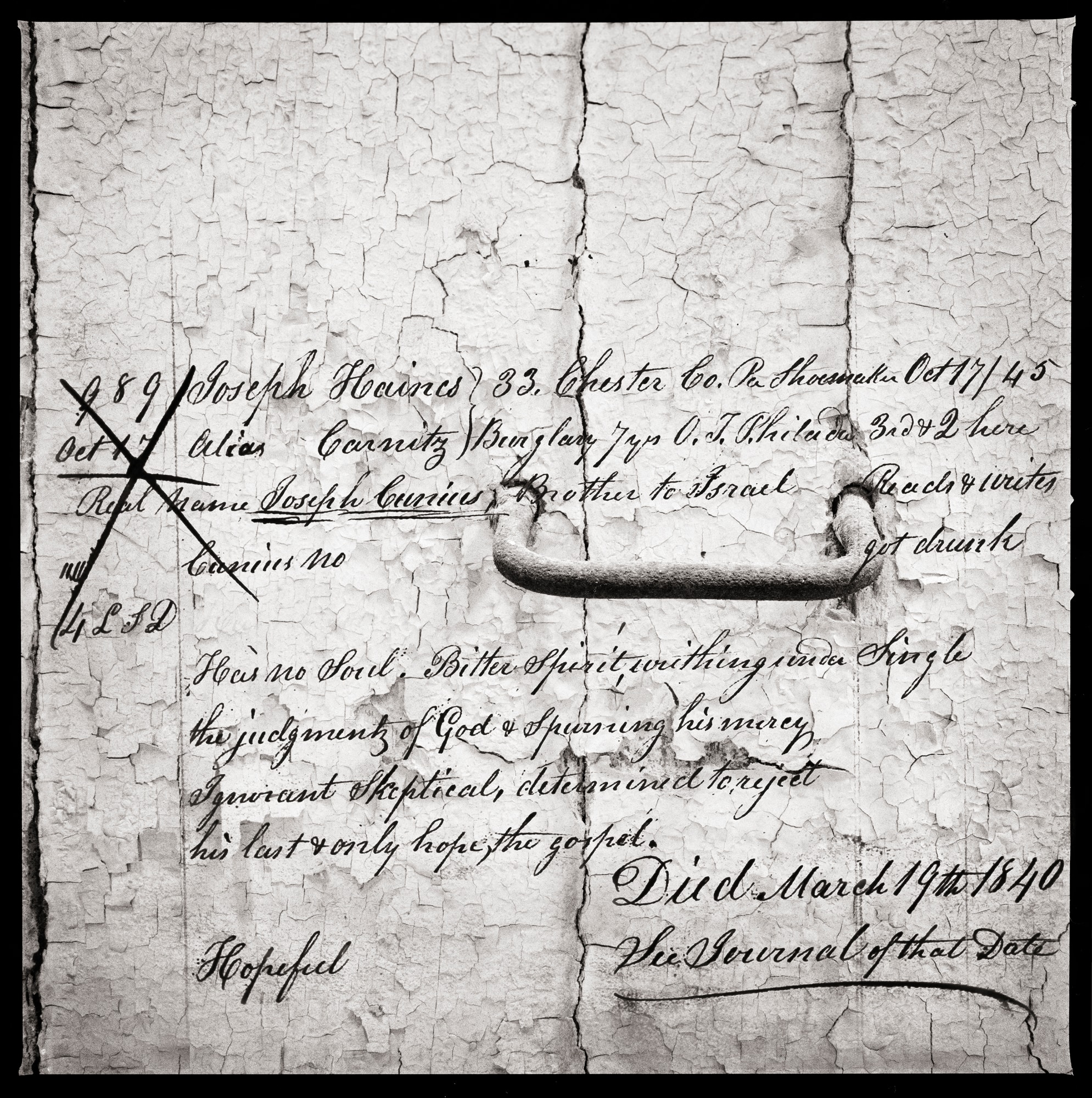 Joseph Haines by Eric T. Kunsman  Image: ID: A black and white image shows a wall with a handle mounted in it.  Overlaying the image is information about the former prisoner Joseph Haines.