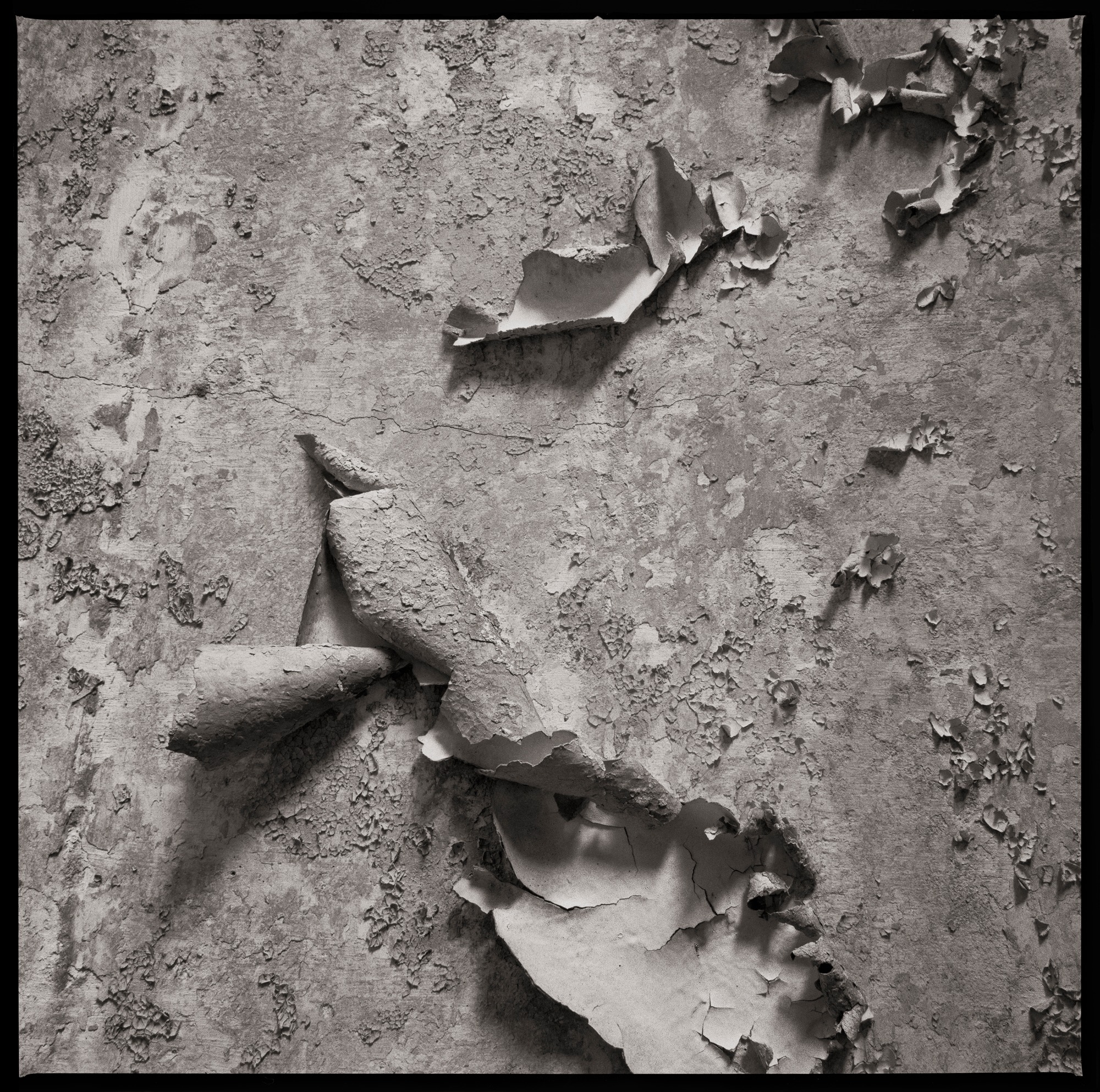 Passing of Time by Eric T. Kunsman  Image: ID: A black and white image shows paint curls and dirt and dust on the floor.