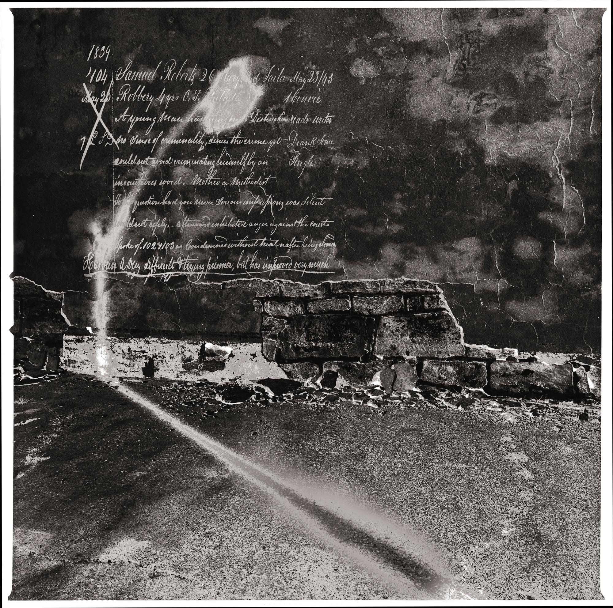 ID: A black and white image shows an image of a half bricked wall with cracked plaster. Overlayed on the image in white writing is a description of the prisoner Samuel Robertz.