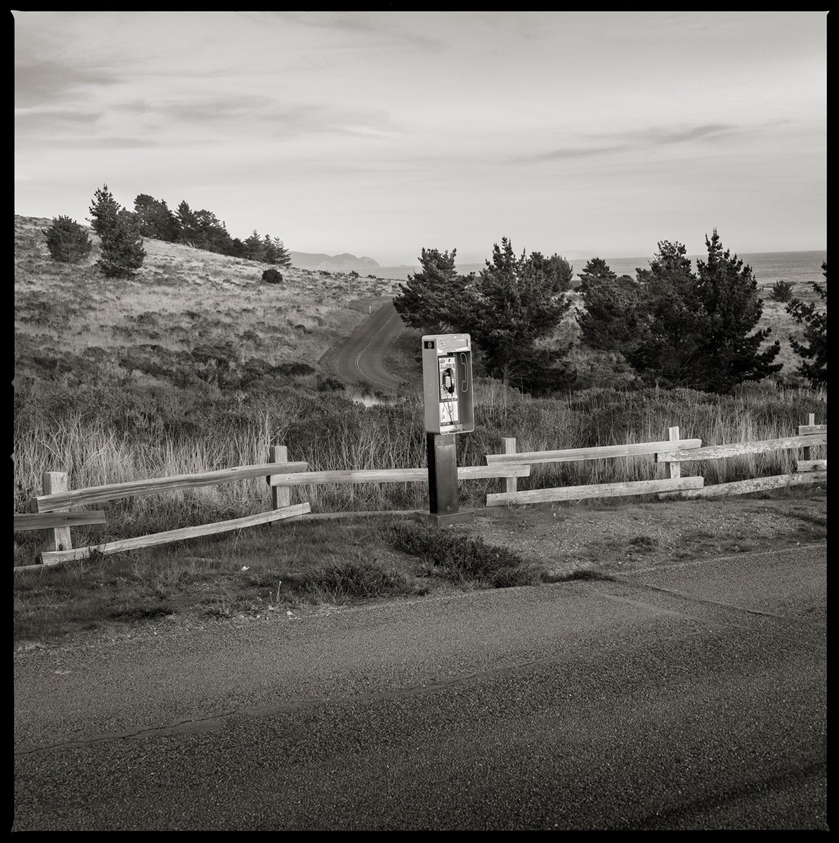 Unknown Number– Point Reyes National Seashore, CA by Eric T. Kunsman  Image: ID: A black and white image shows a payphone in front of a wooden fence.  Behind the fence is a grassy hill with trees.