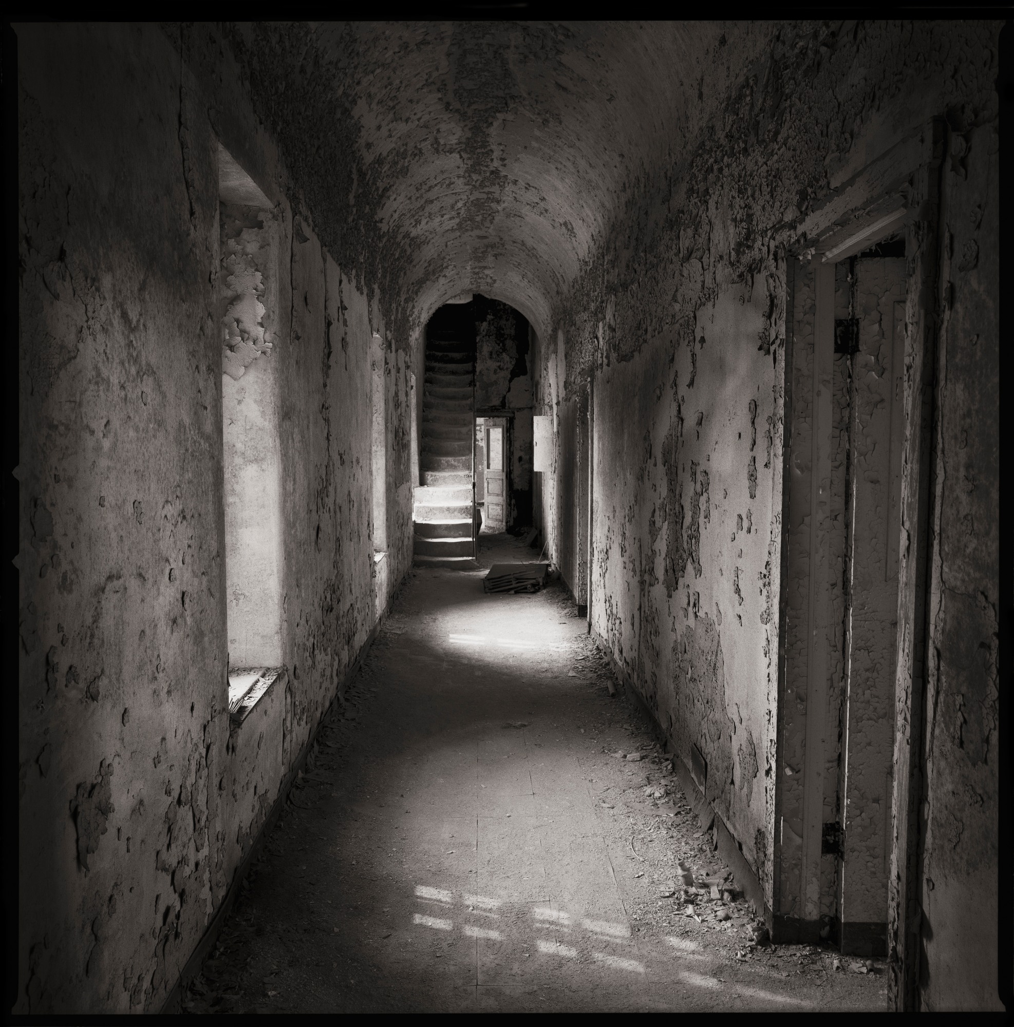 ID: A black and white image shows a corridor with a curved ceiling and windows on the left wall. There are doors on the right. The walls and ceiling are cracking cement.