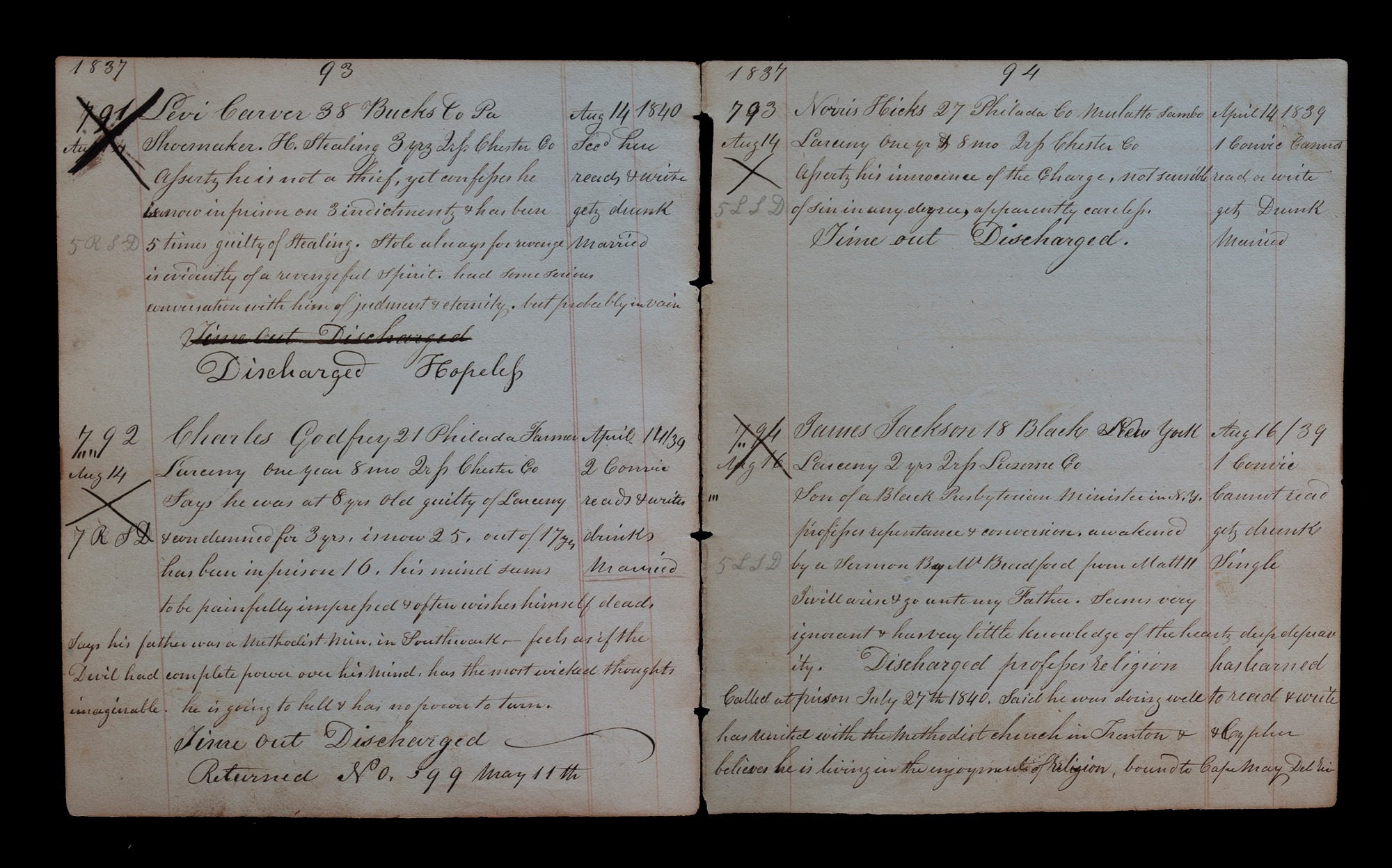 Warden's Logbook 1837, Page 93-94 by Eric T. Kunsman  Image: ID: A black and white image shows an open log book with cursive writing.