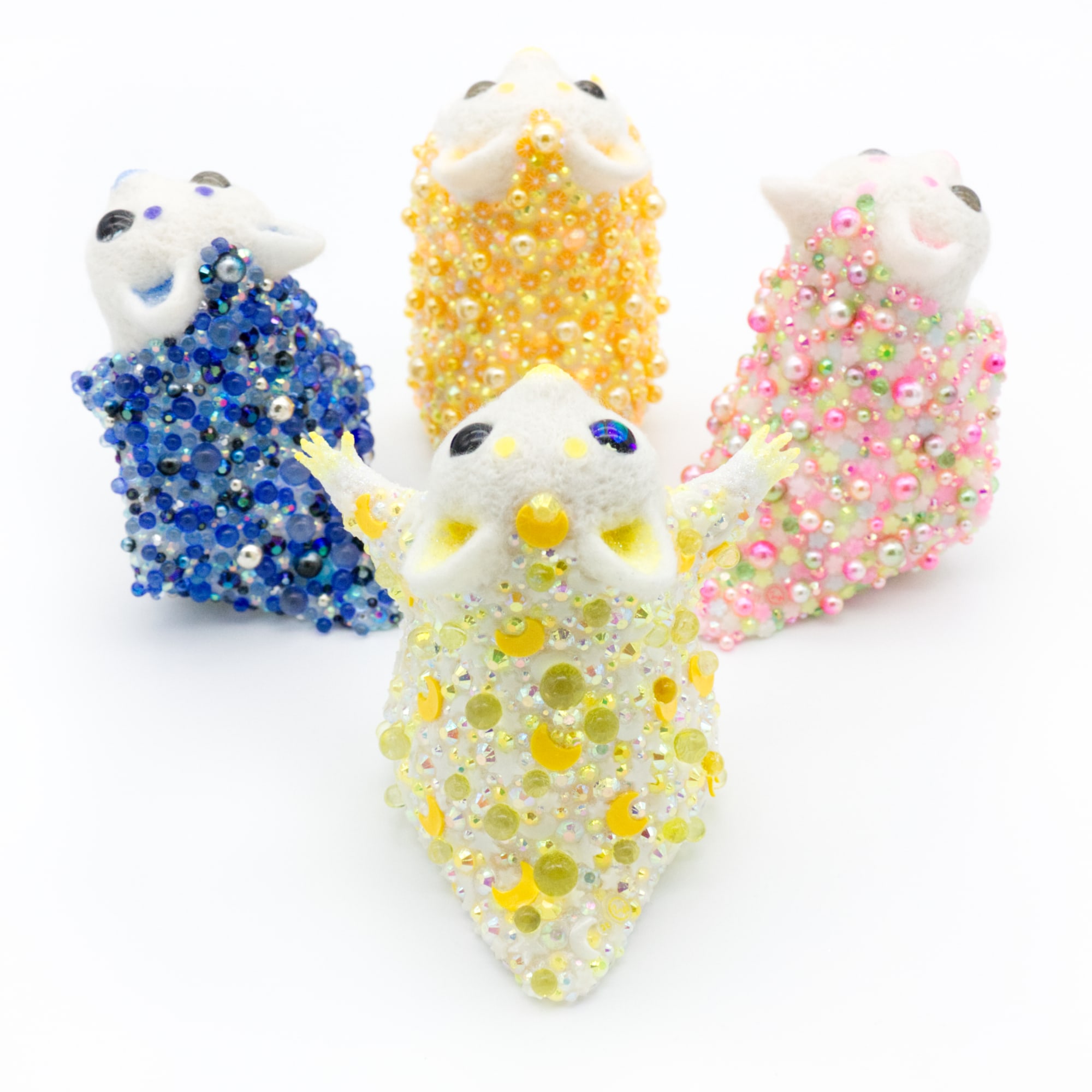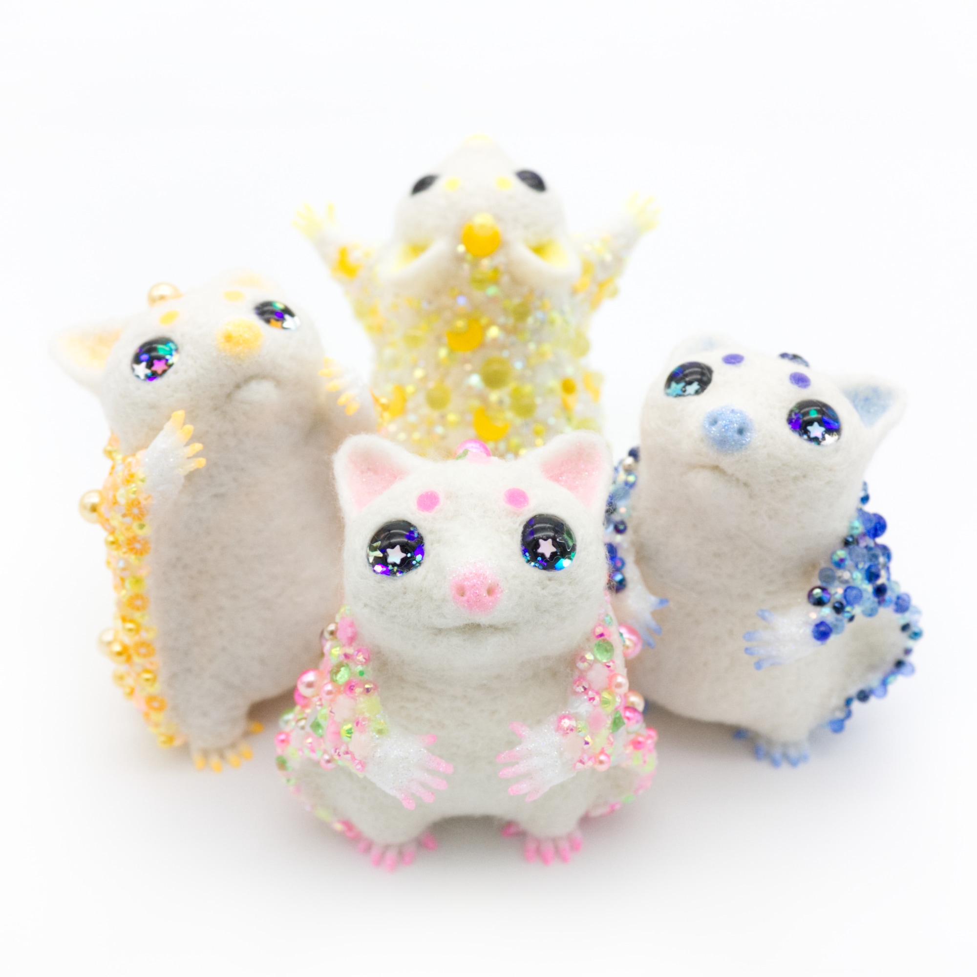 - wool felt, resin, polymer clay slices*, acrylic paint, rhinestones, glitter, hand painted glass eyes