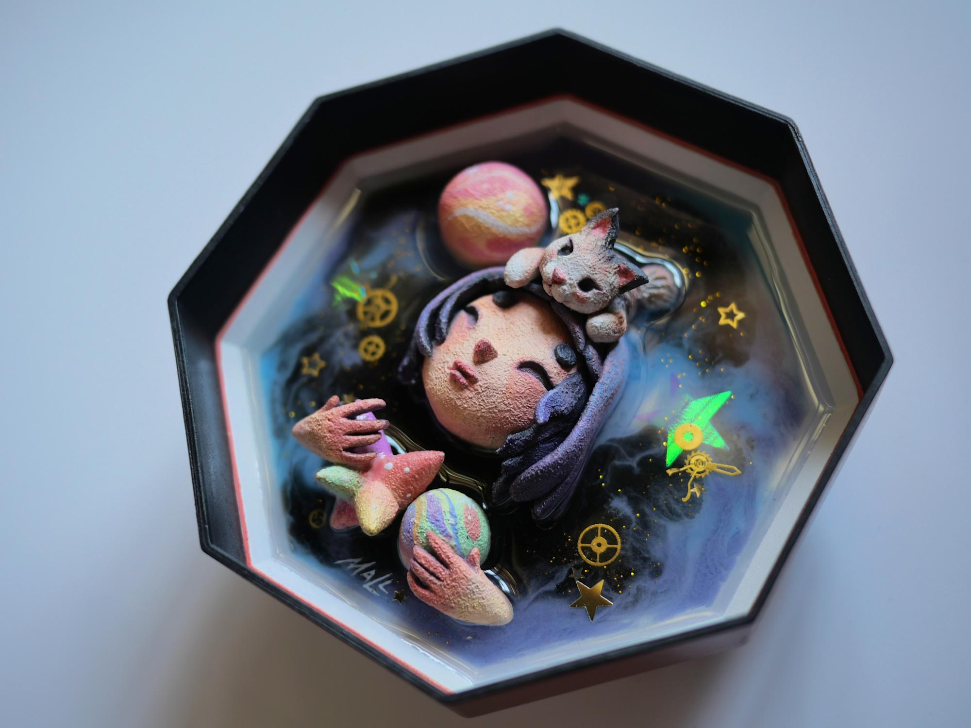 - Subject Matter: sculpture, moon, stars, woman, girl, cat, glitters, resin, universe, galaxy, planets, hexagon, stars