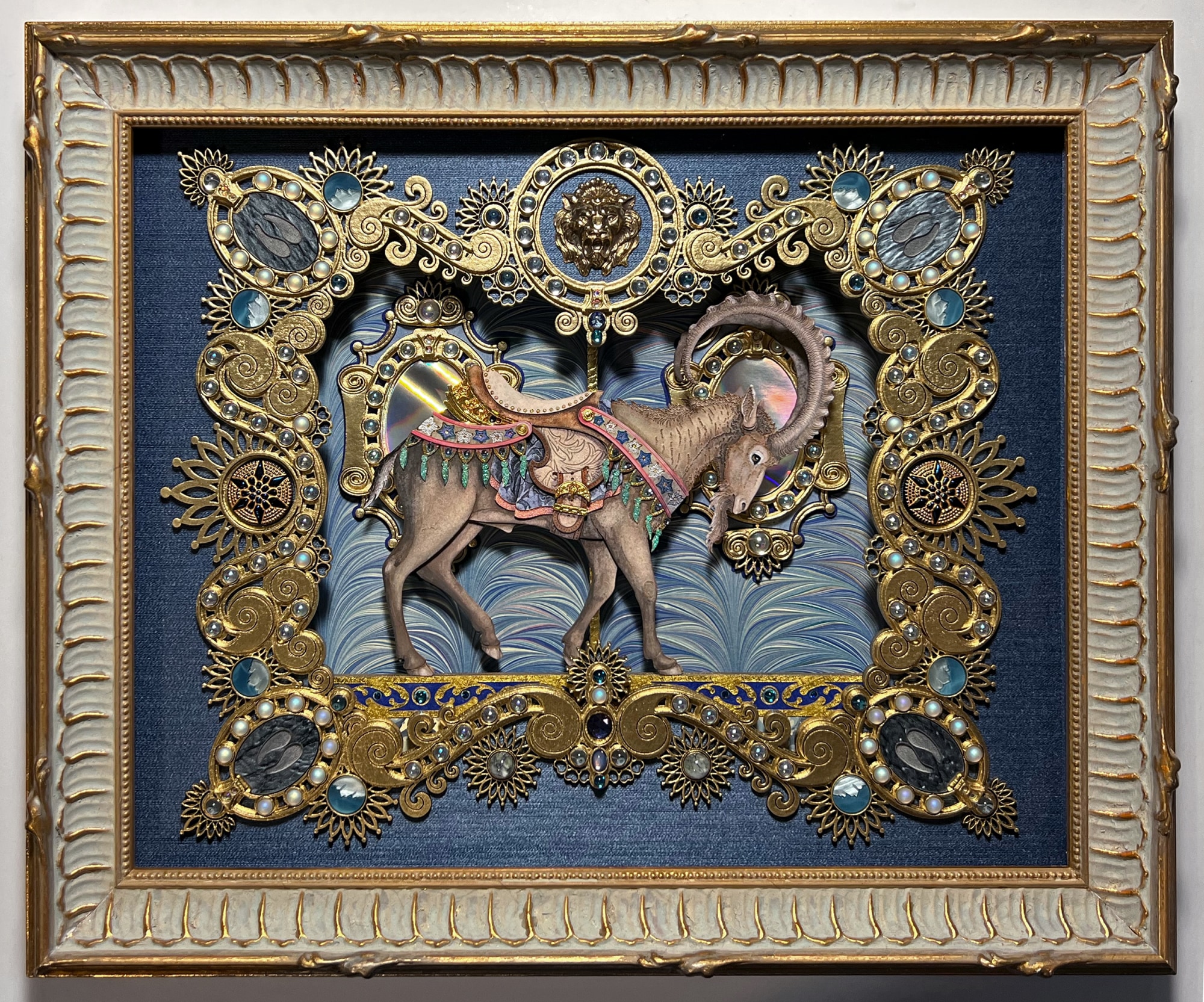 • Cut Paper, Watercolor, Gouache, Acrylic, Brass, Vintage Glass Rhinestones, Swarovski Crystals, and 24K Gold Leaf