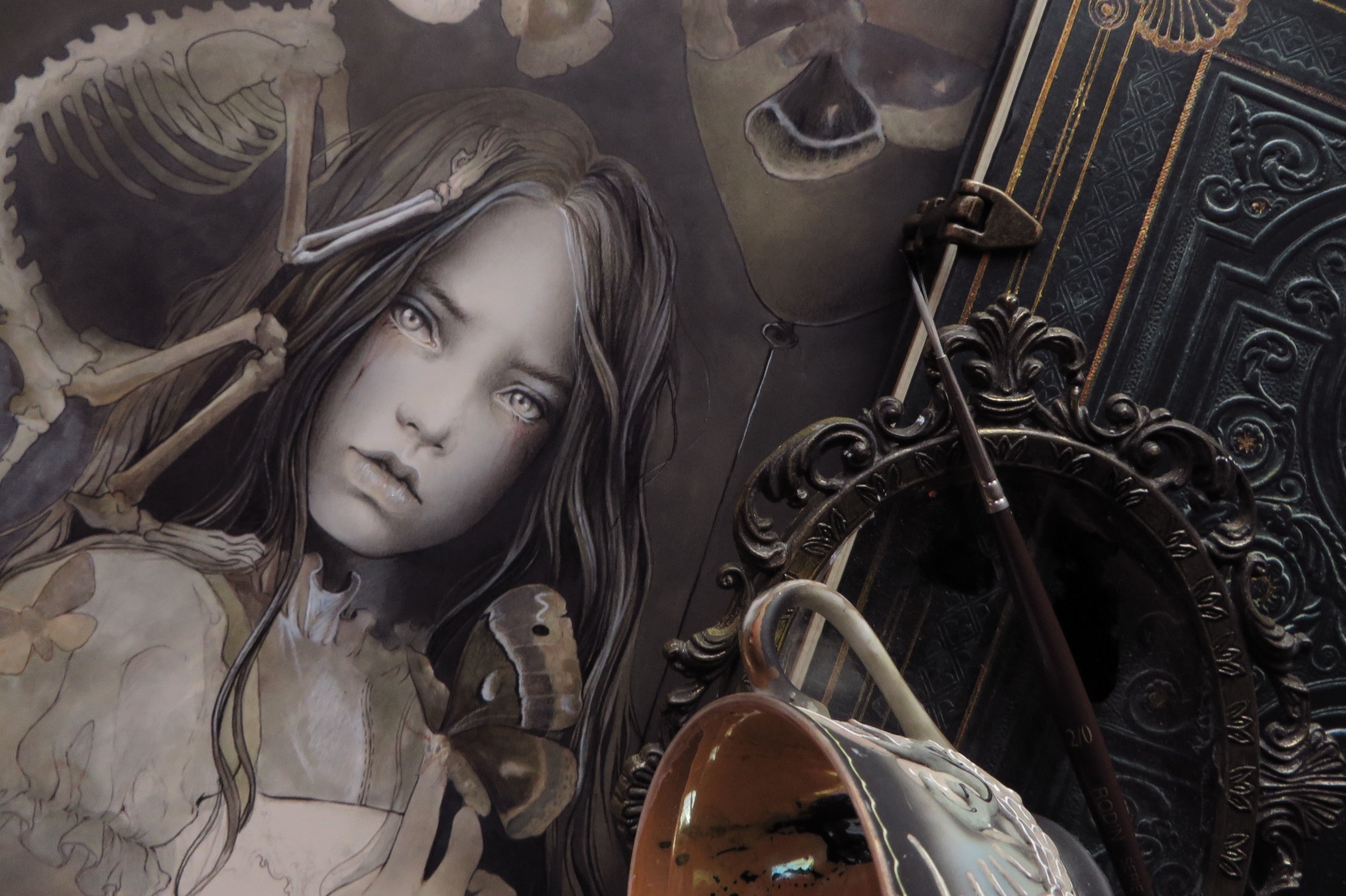 - mixed media, watercolor, gouache, inks, markers, pastel color, graphite and colored pencils on cardboard