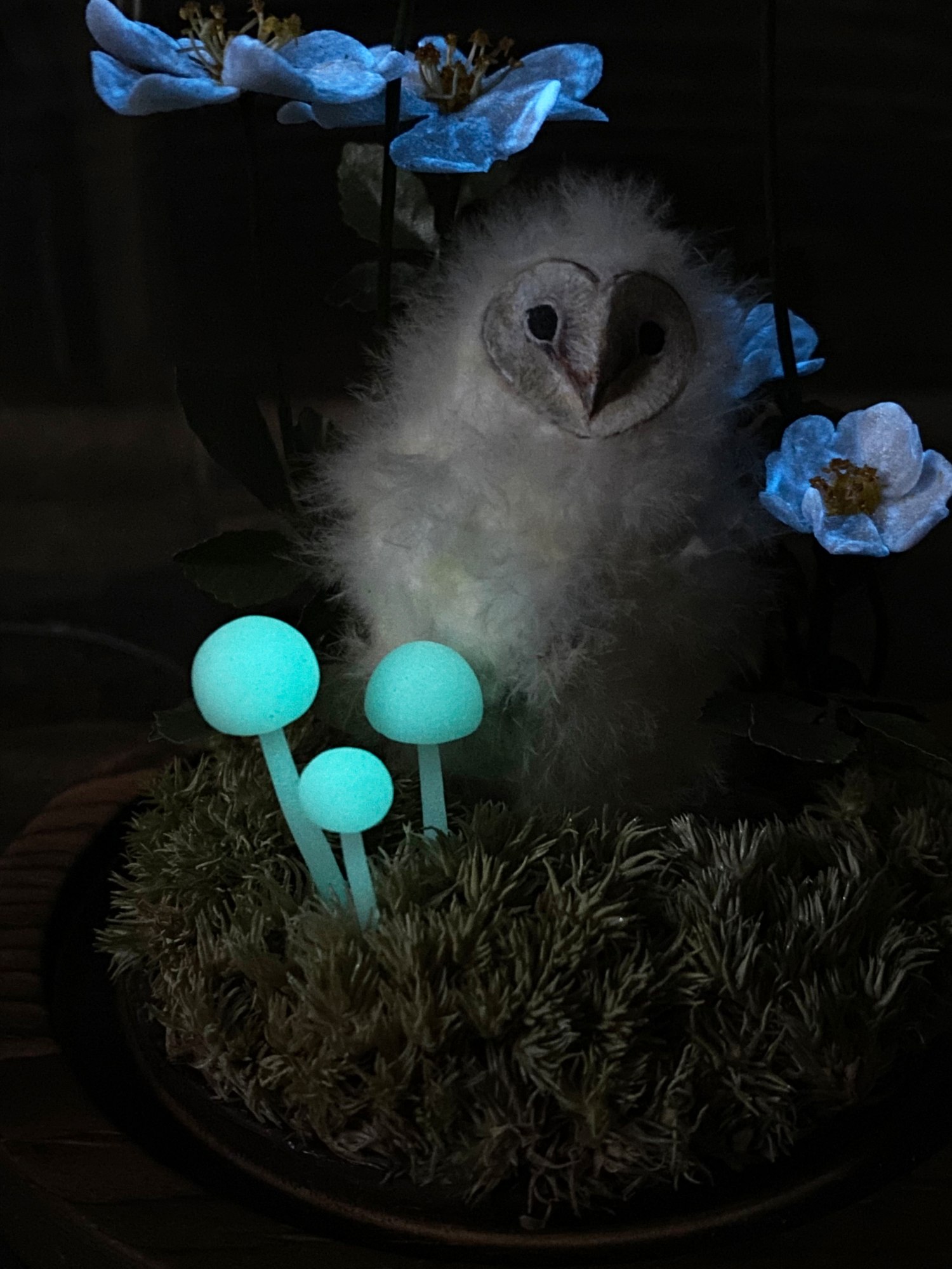 - Mixed media; glass and wood dome, polymer clay and acrylic paint, down feathers, preserved moss, paper clay
