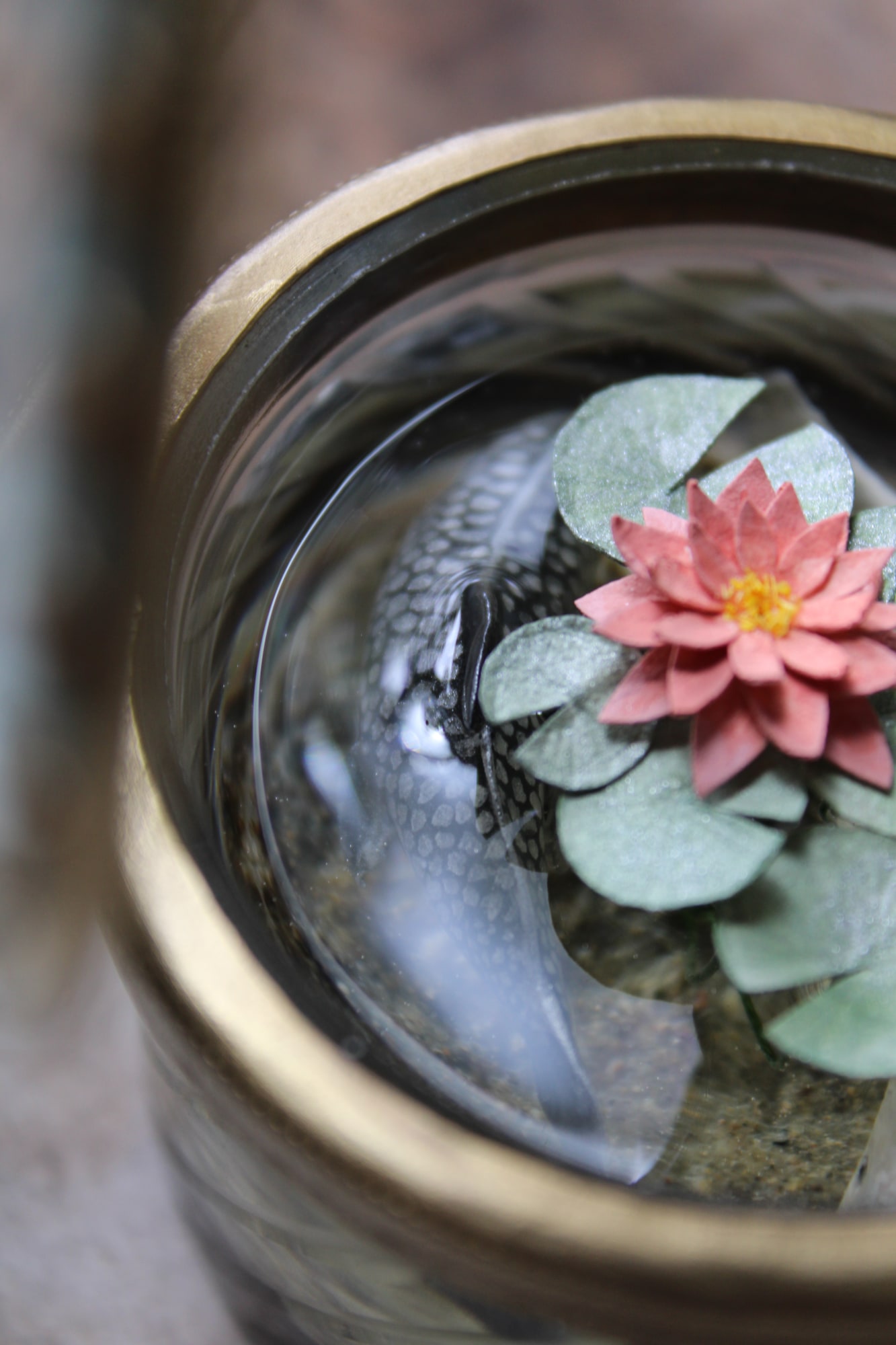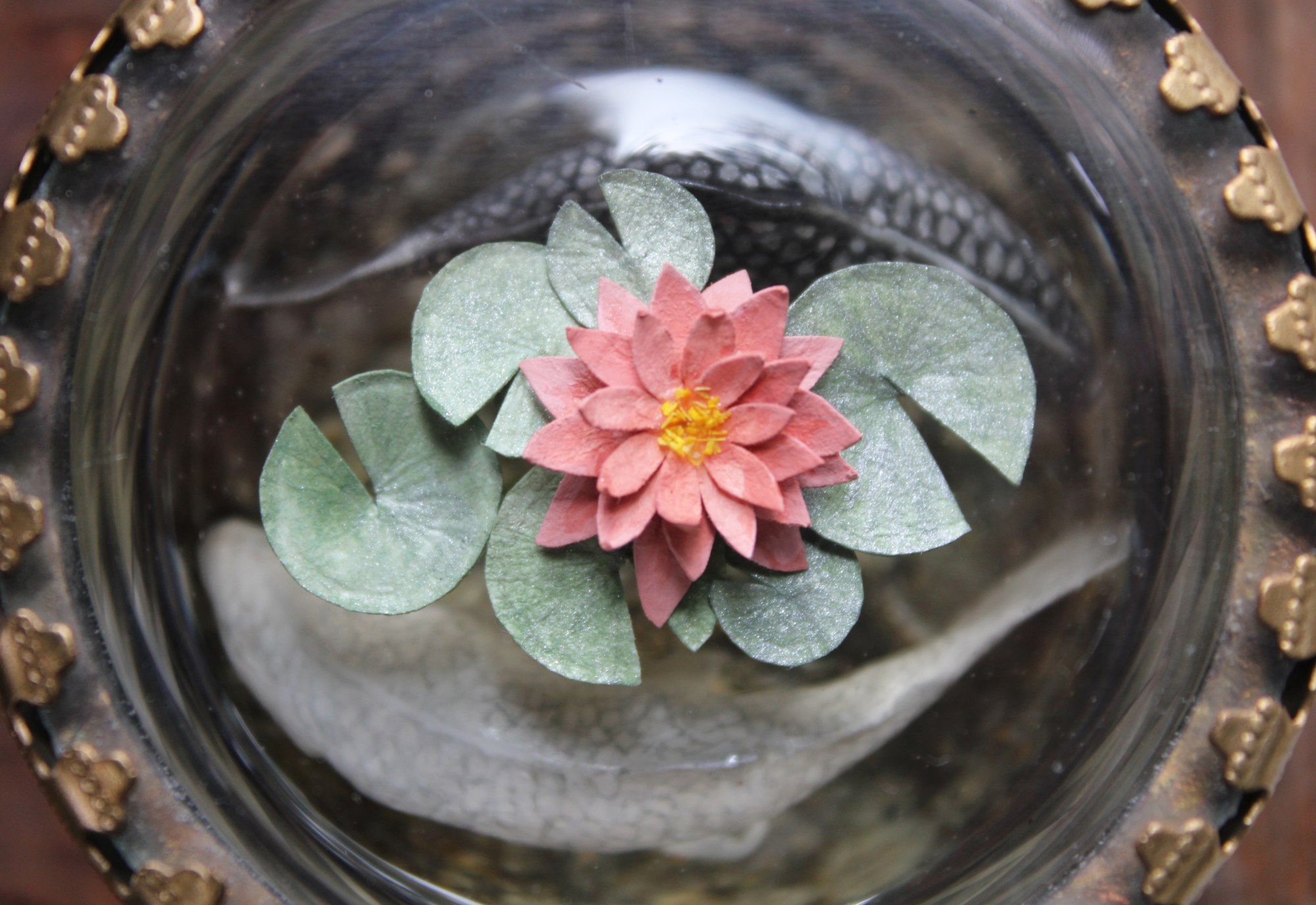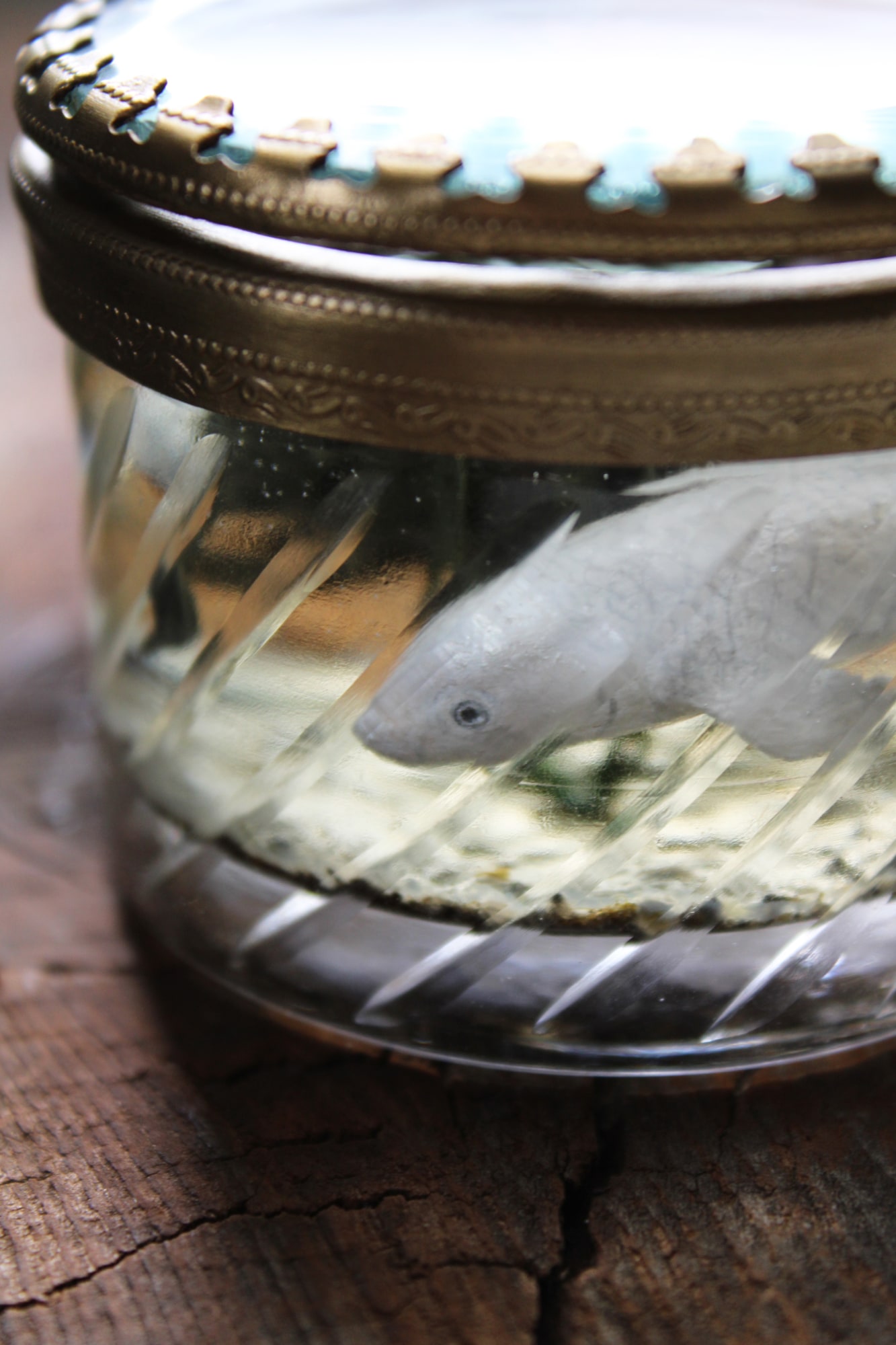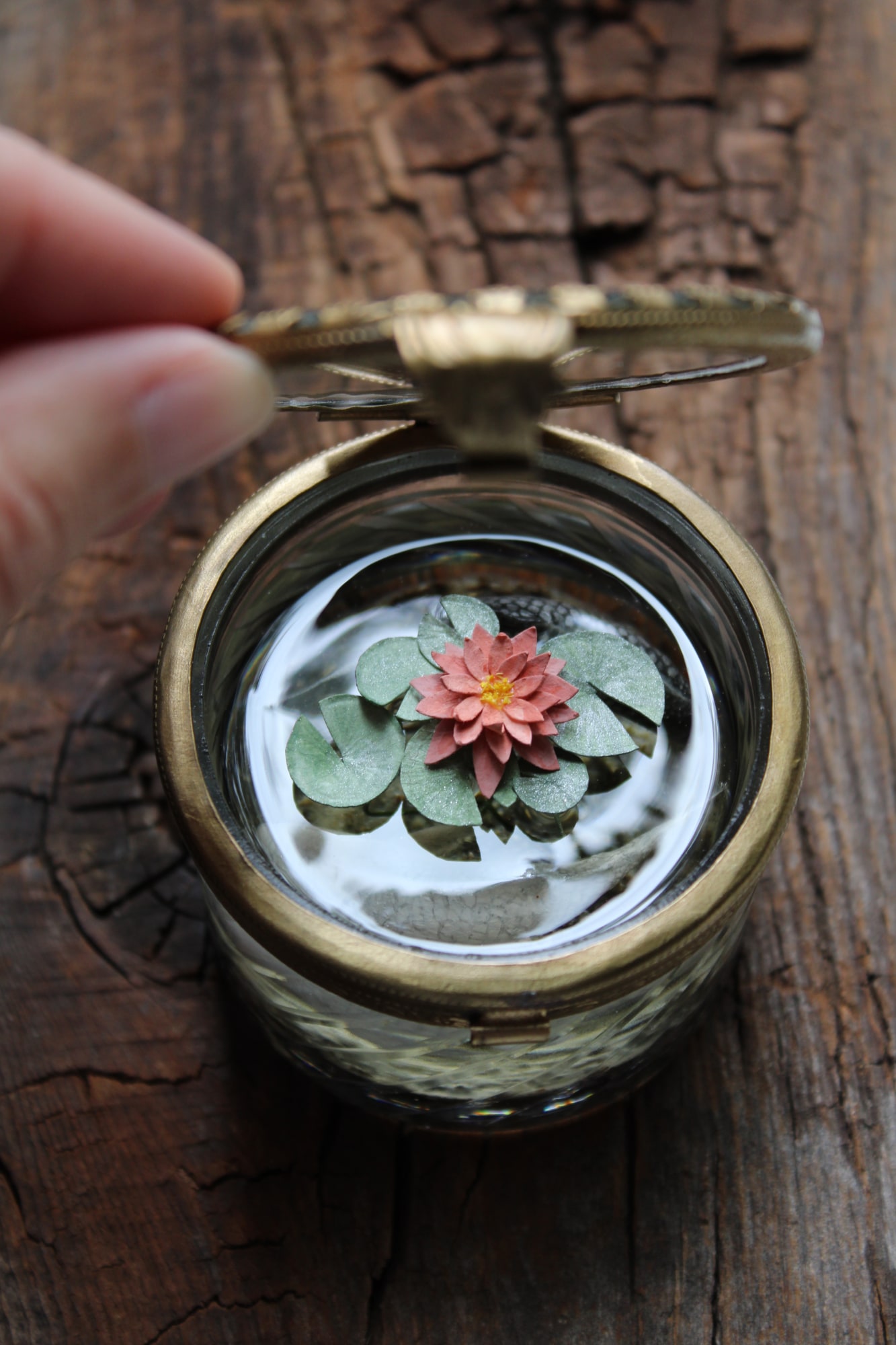 - Glass box, epoxy resin, polymer clay, acrylic paint, sand, paper and wire