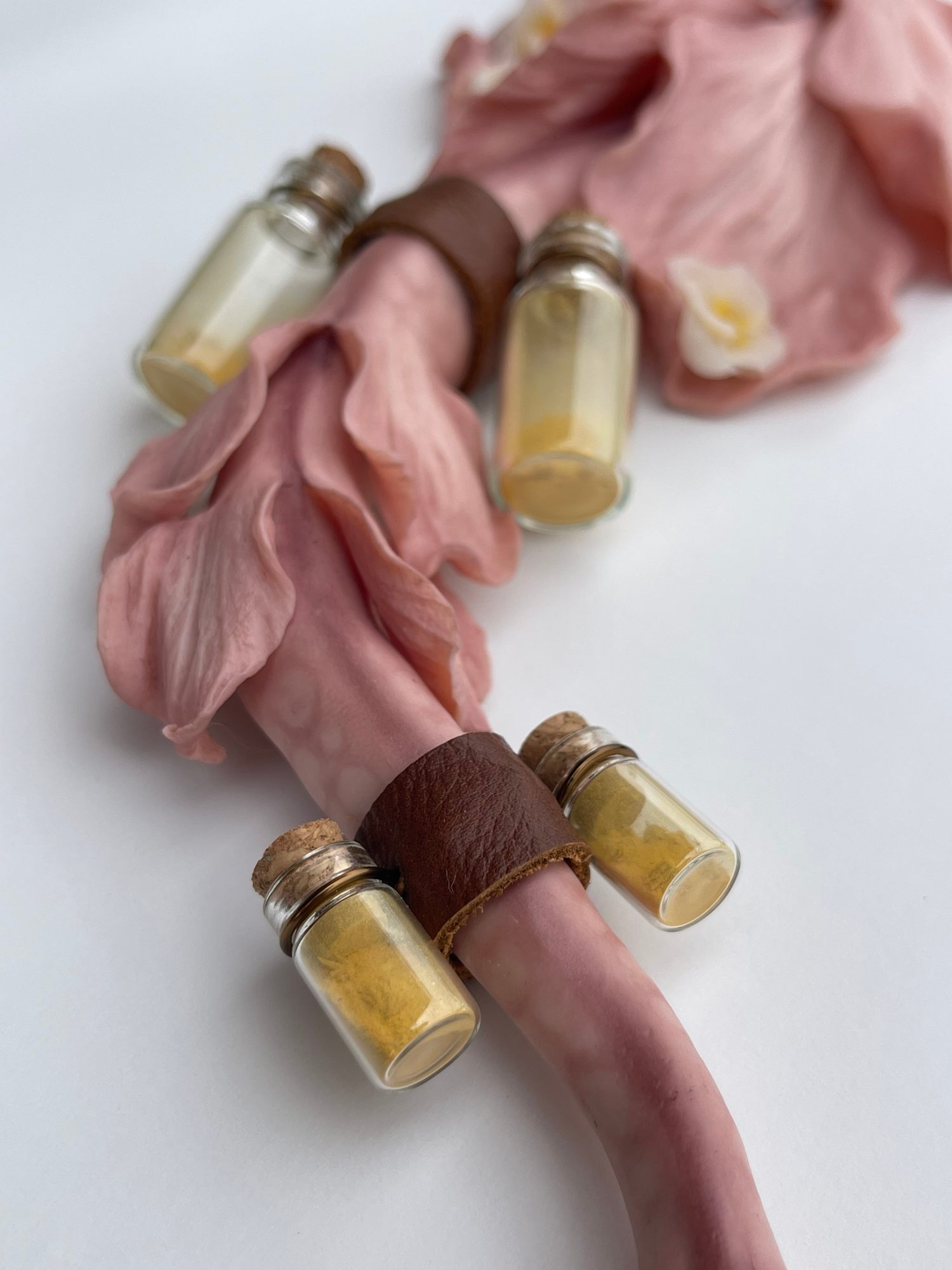 - Clay, mica, leather, glass, wool, pastel dust, dried flower buds, metal findings
