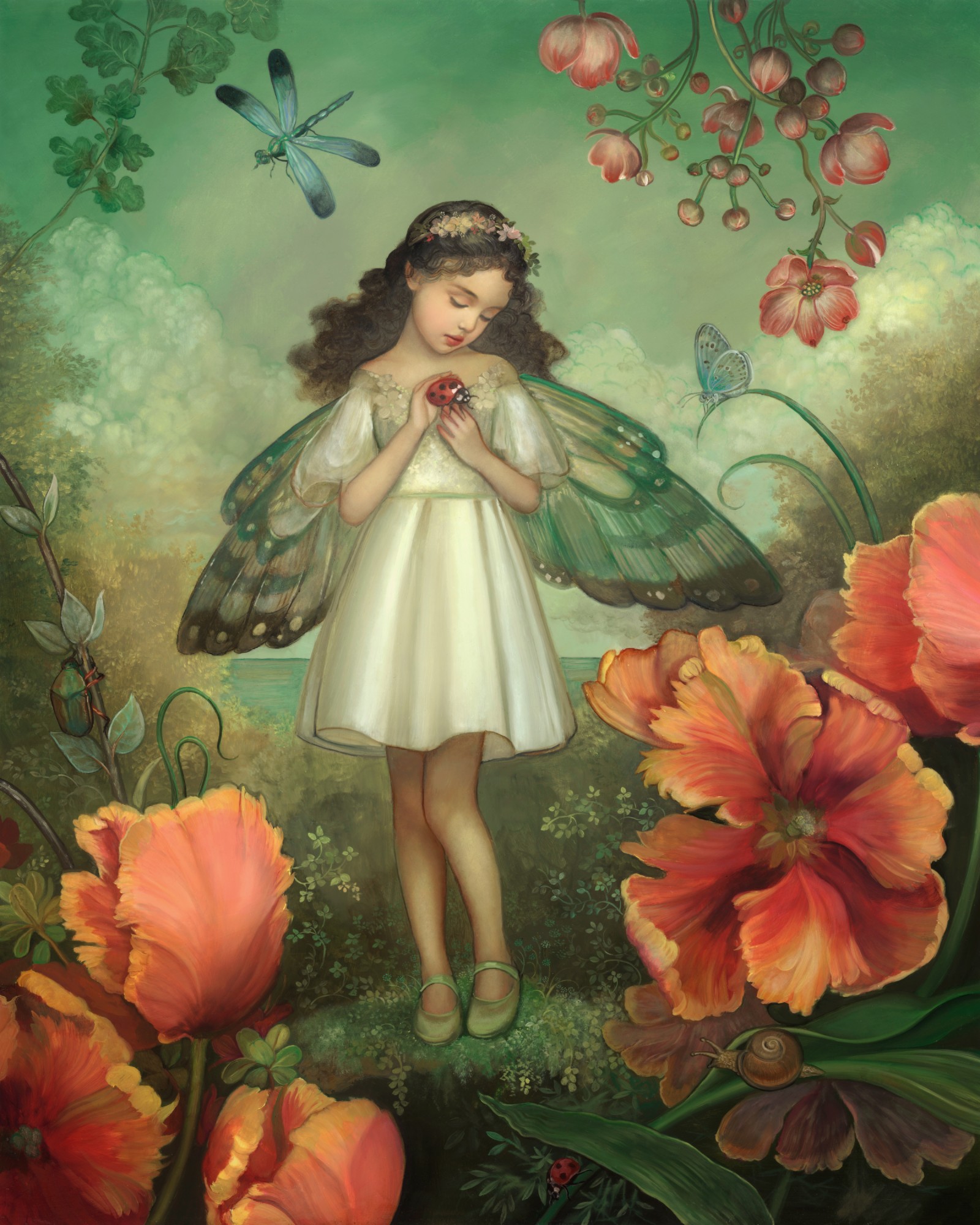 A fairy cradles a ladybug in her hands