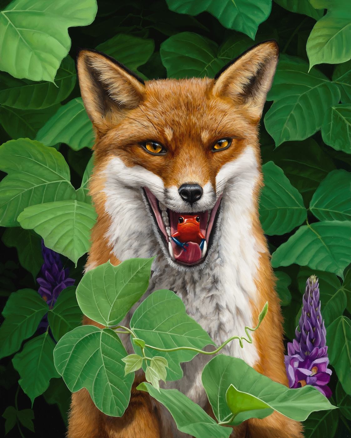 Neo is a piece with a lot of layers. The fox has a poison dart frog on its tongue, contemplating whether to consume it or not. I see the frog in a couple of ways. The red and blue represent American politics and the piece reflects on our consumption of it and the resulting poison we ingest. I also see the frog like the red pill and the blue pill from the Matrix, hence the title "Neo", the protagonist from the film. Red pill showing you reality, blue pill showing you the simulation. Sometimes I think I would prefer to be plugged into the Matrix and escape the overwhelming world we live in. But then again, maybe we are in the matrix. There's also the Kudzu vines that surround the fox. These vines are known to be fast growing that cover and choke the things it grows on and represent the threats of the piece. The fox is clever, so the outcome of this piece isn't cut and dry.