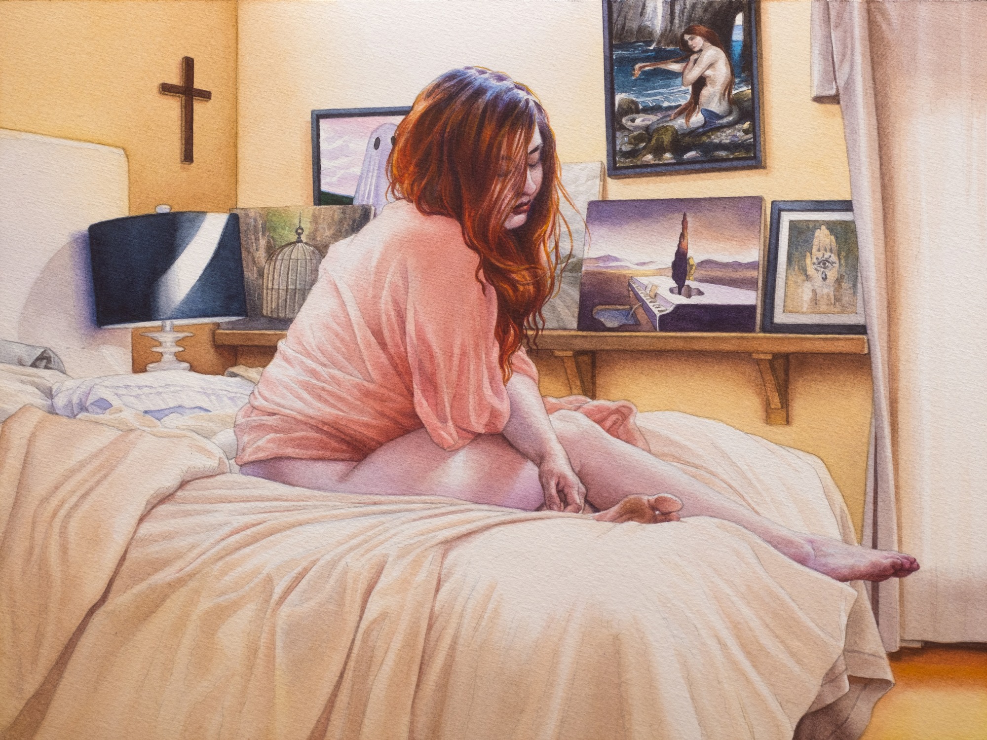 This piece is inspired by the music of Tori Amos, specifically, her 1992 album, Little Earthquakes. I've been a huge fan of Tori Amos' music since I first saw her perform live, late one night, on MTV's show 120 Minutes. Her music had a massive influence on me as an adolescent navigating who I wanted to be as I grew up. Her themes of self empowerment, loss, heartbreak, religious dogma, melancholy, and rebellion in the face of so much hypocrisy aimed at young women really informed me on a personal and artistic level. For this small homage to Tori Amos' music, I dug deep into the themes and tones present in the album. Rather than depict one particular scene or song, this painting takes its cue from the overall feeling and imagery present in her music. It is littered with visual references to lyrics from some of her most well known songs including, Crucify, Silent All These Years, Precious Things, Happy Phantom, Tear In Your Hand, and Little Earthquakes. Once I finished this painting I sat down with it, put on my headphones and listened to Little Earthquakes in its entirety. For anyone that is a Tori Amos fan or knows that album well, I encourage them to do the same.