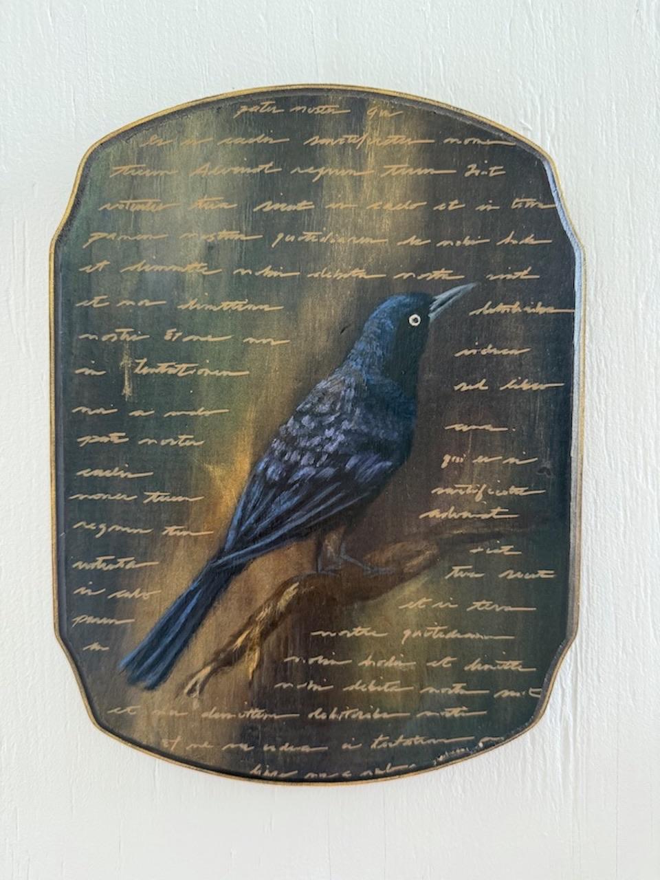 A visual prayer layered with the Latin text of the “Our Father,” the bird becomes a quiet observer of grace, a reminder that peace is found when we surrender and listen.