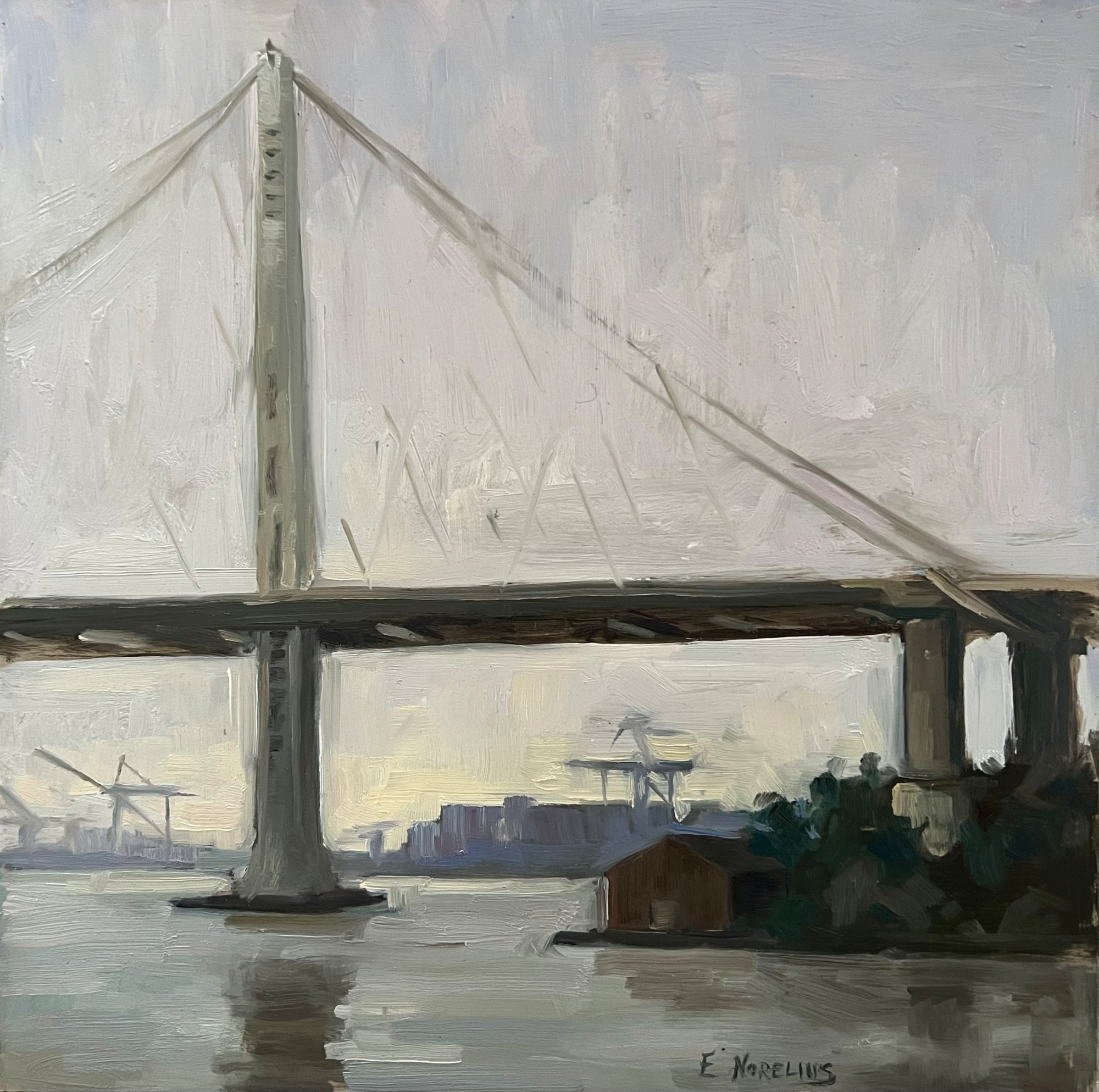 The coastal Bay Area region has a lot of foggy mornings and this painting depicts a typical summer morning looking out across the bay. In the foreground is the Bay bridge as it connects to Treasure Island. In the distance is the Oakland harbor, with its loading cranes and shipyards.