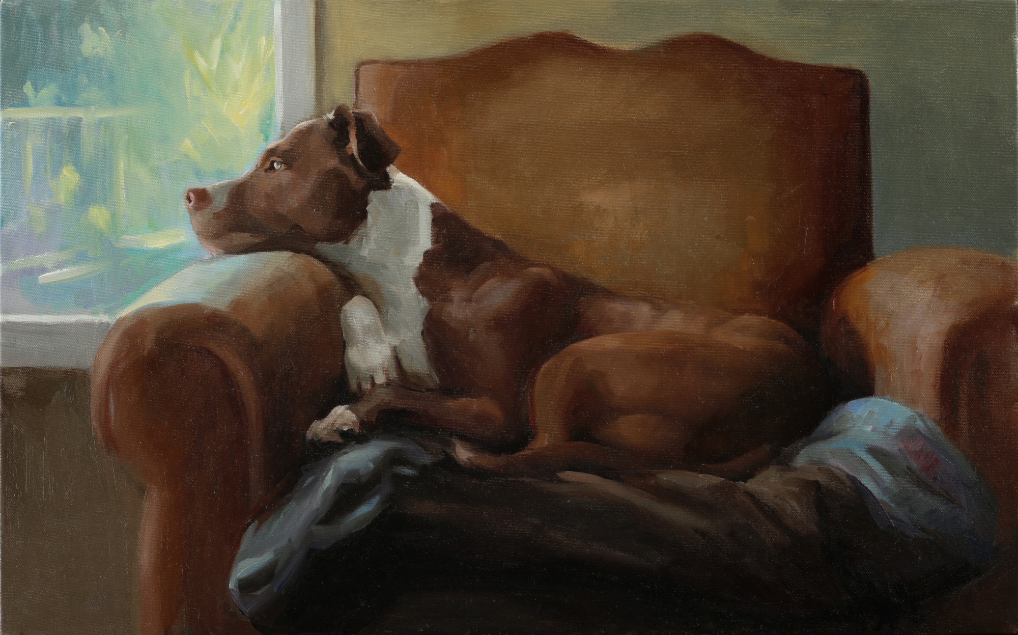 Painting of my dog Bosco sitting by the door in his favorite chair. This was painted as a gift for Kristian around Christmas 2021, but not finished until 2022.