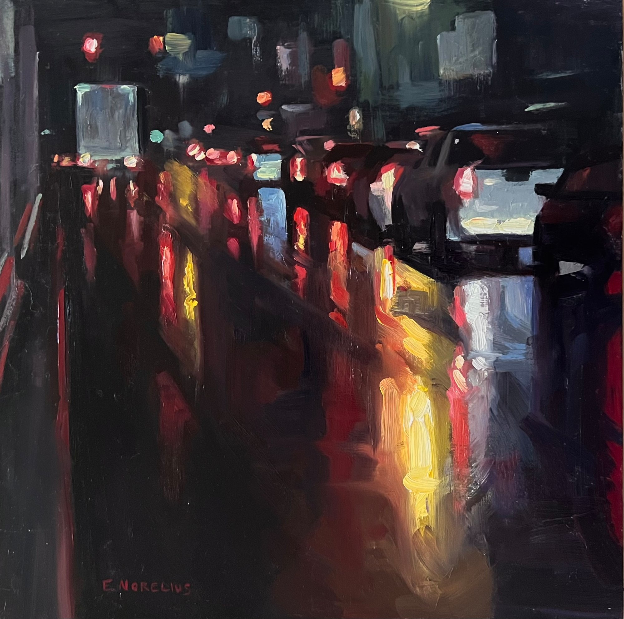 I love the reflections of lights bouncing off the streets in the evening. This is a small painting, slightly abstracted, in order to push the quality and color of the lights.