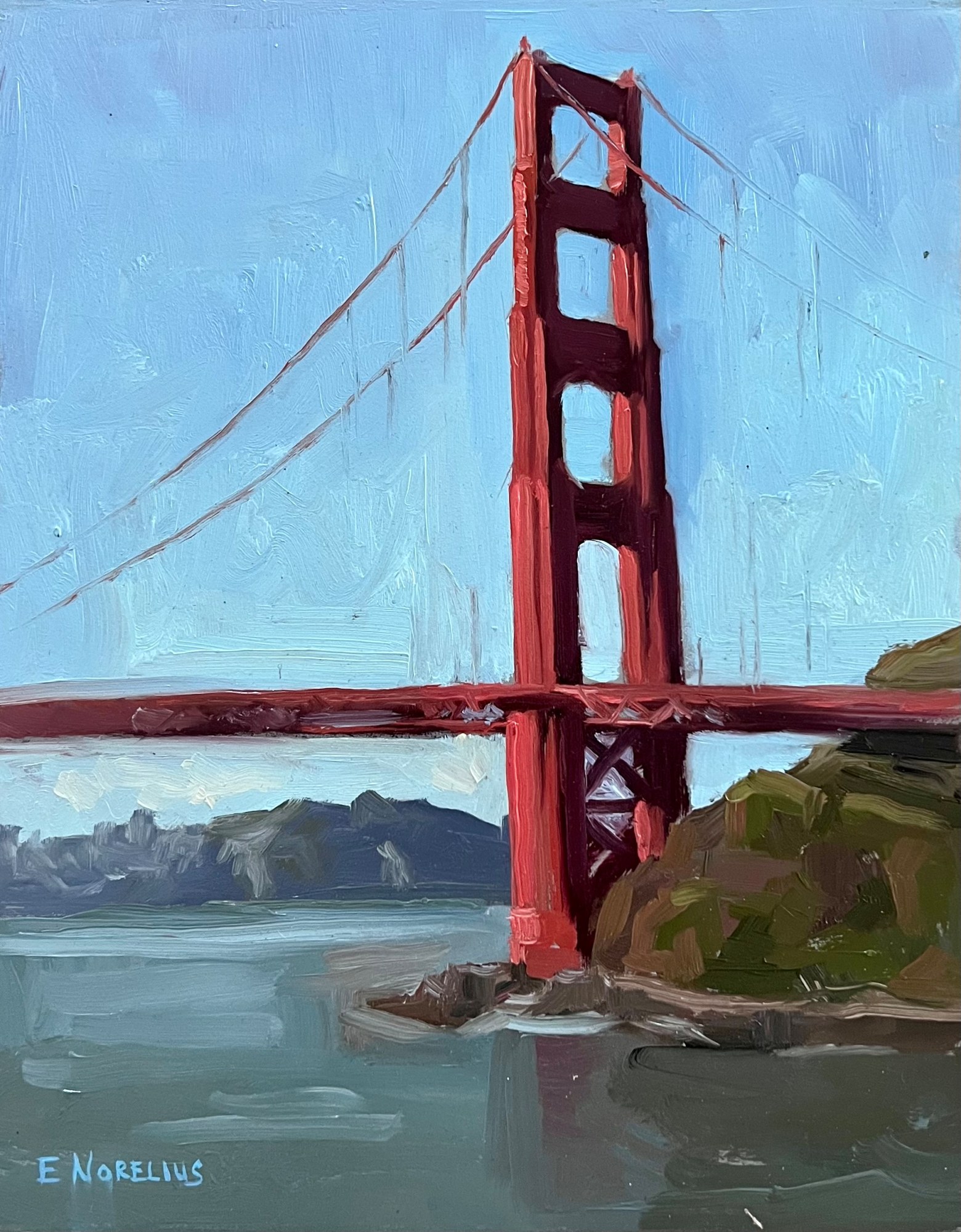 This is a plein-air painting of the iconic Golden Gate Bridge of San Francisco. I painted this scene from the Sausalito side of the bridge, near an old battery off of Horseshoe Bay. Fortunately for me, the morning was sunny and clear and allowed the red of the bridge to illuminate against the blue of the sky.