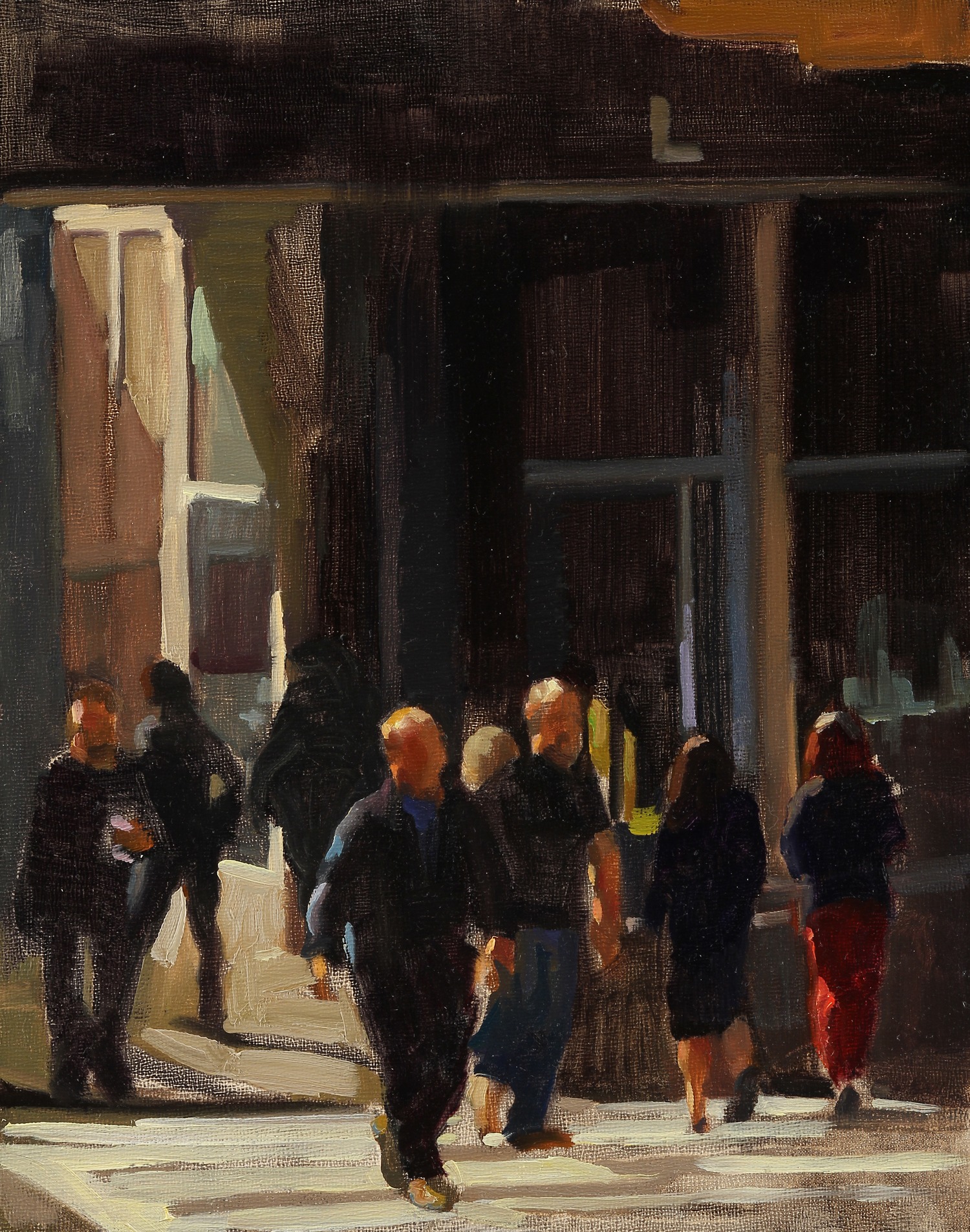This painting depicts people walking on the streets of San Francisco. I love painting people on the streets and capturing the energy and gesture of the pedestrians as they walk past each other.