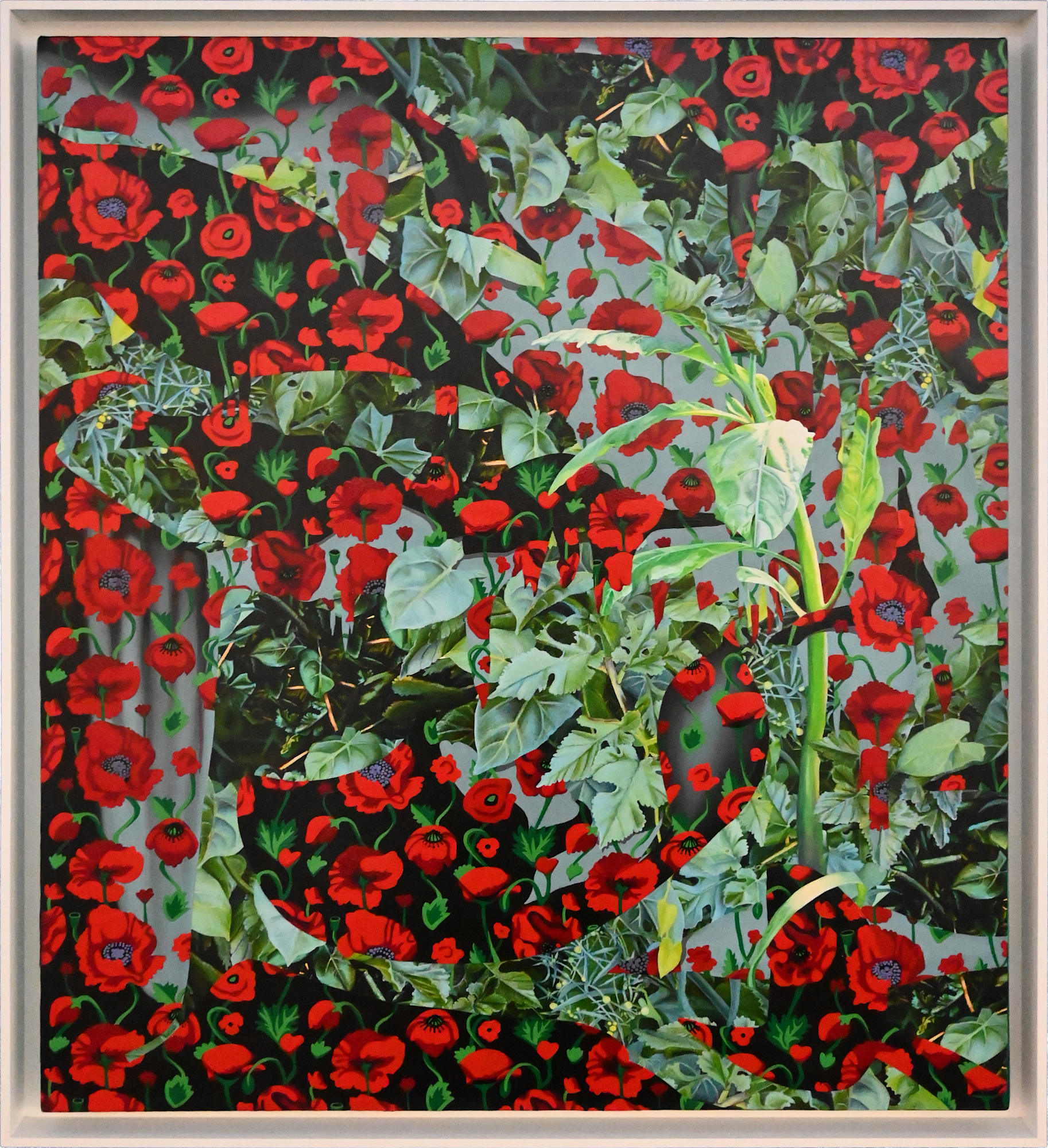 “Begin Again” is a contemporary maximalist oil painting by Sarah Jacobs. The densely-packed composition is an interplay of pattern, depth, and contrast. The design of red poppies and deep green foliage are interrupted by areas that reveal paler green leaves and a quieter background. The complementary colors of the flowers contrast the three-dimensional leaves, creating a dialogue between realism and stylization.