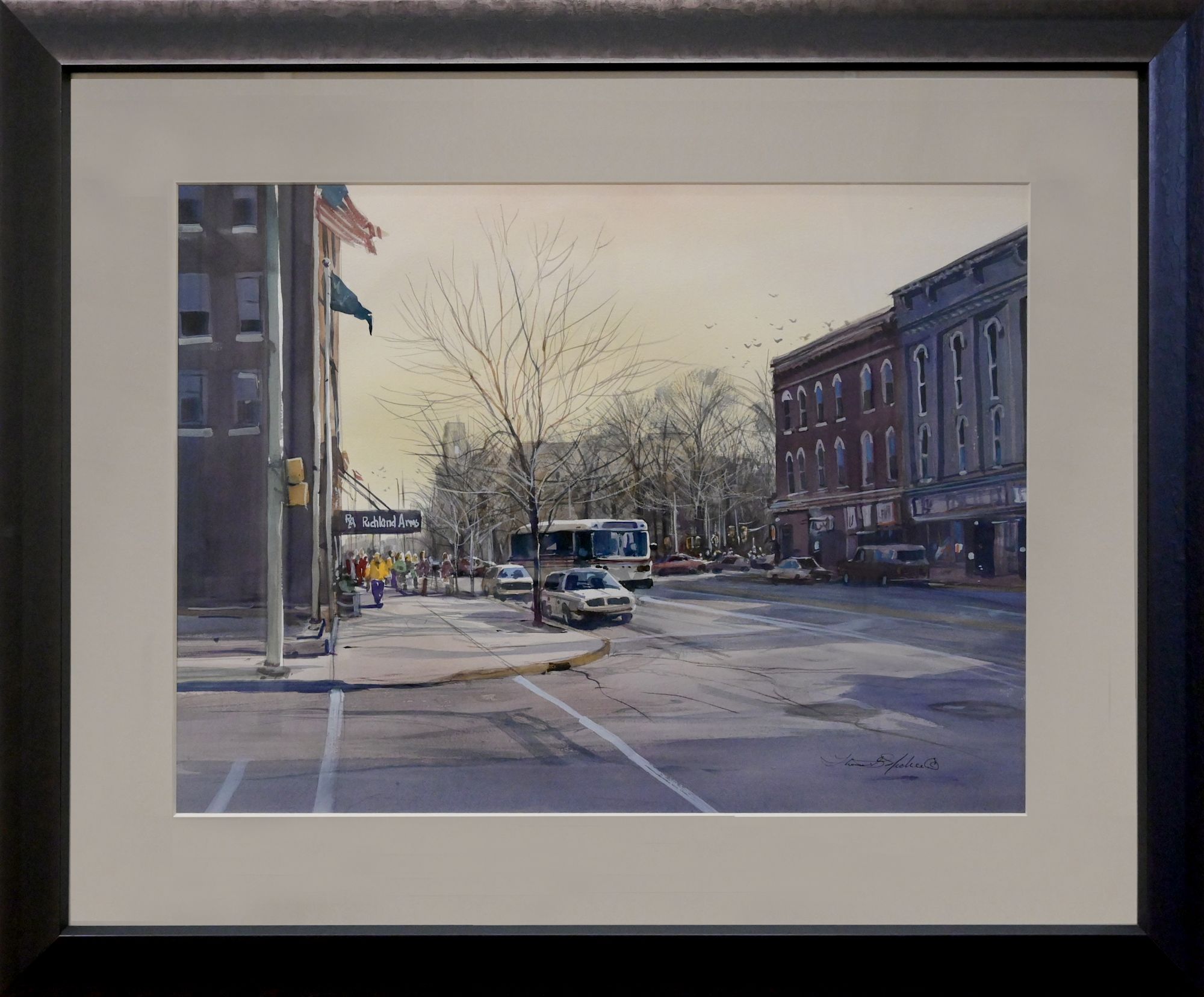 Thomas McNickle captures a downtown Erie street in the glow of the early spring sunlight. The artist's use of light and shadow creates depth and a calm, moody atmosphere as city life carries on.
