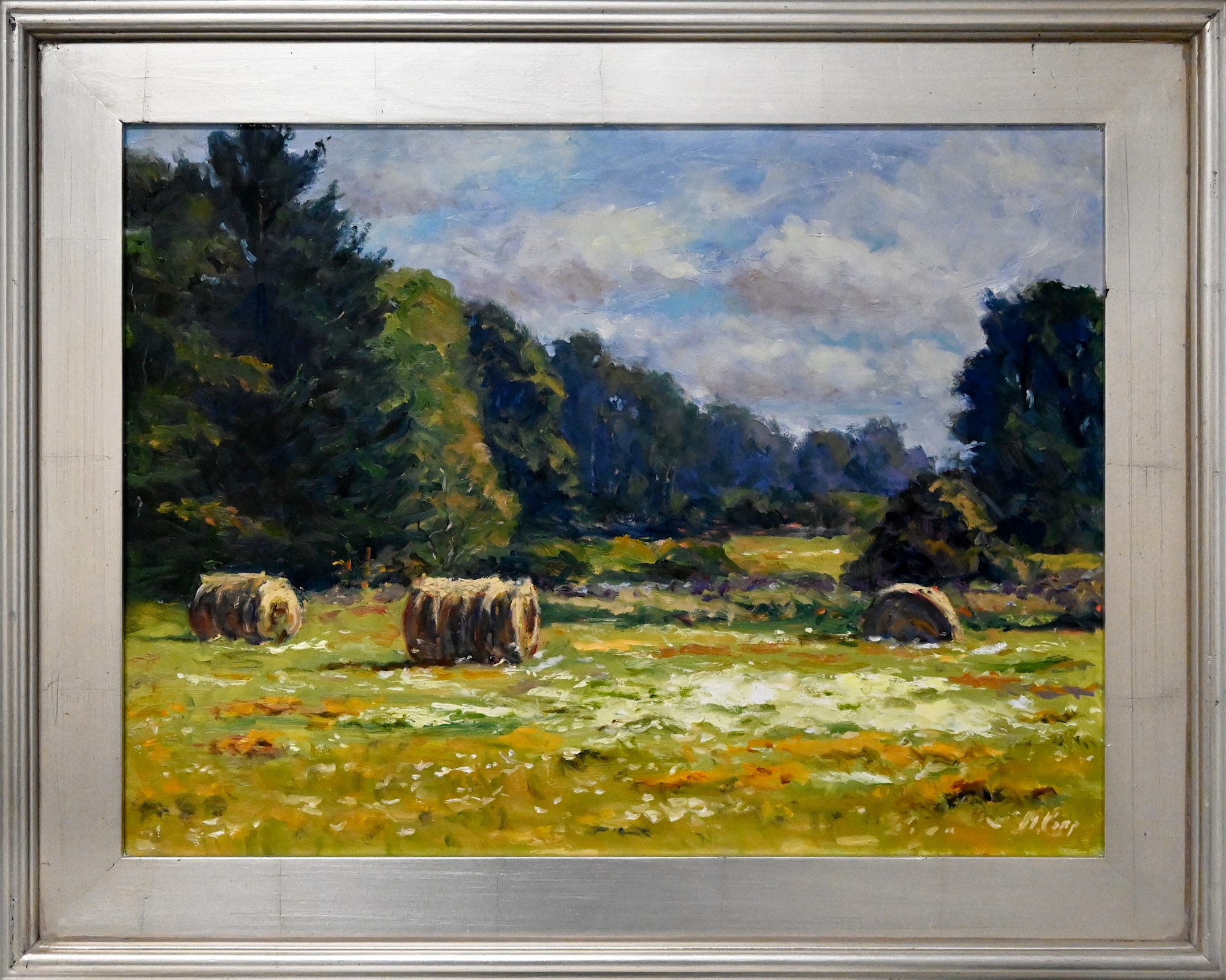In Michael Camp's pastoral landscape, three large hay bales rest in an open field. The sky and its fluffy white clouds loom above a swath of dark trees that cut across the landscape. Camp uses a painterly brushstroke reminiscent of the Impressionist art style. These loose brushstrokes suggest that the painting's foreground is comprised of lush grasses and wildflowers.