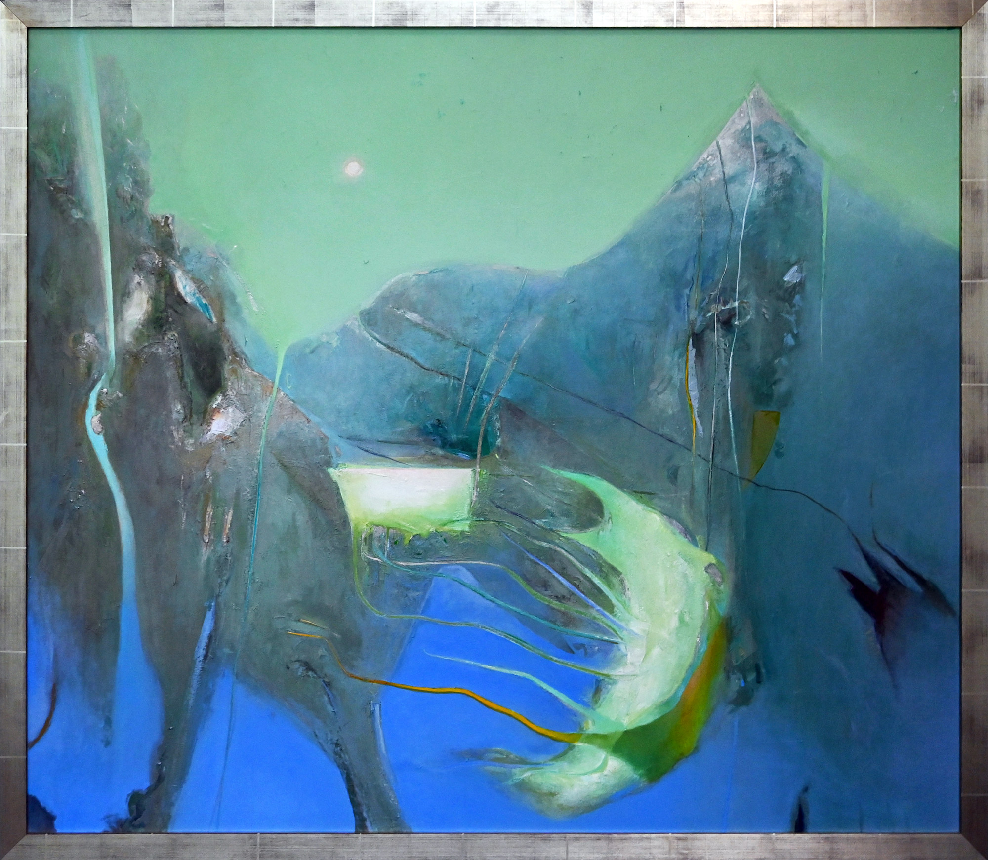 Dreamlike and mysterious, Rob Katkowski’s oil painting “Nocturne” is an abstract landscape depicting a mountainous terrain beneath a rising moon. Craggy forms cut through the illusion of a dreary, celadon sky and a winding river suggest a canyon between the peaks. A glowing, ethereal form drifts through the painting’s foreground, adding a sense of movement and mystery to the surreal composition.